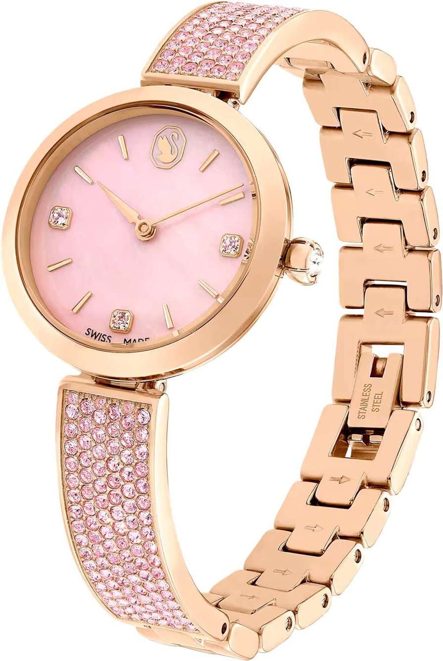Часы Swarovski 5678756 – это воплощение изысканного дизайна и функциональности, созданное для тех, кто ценит красоту и точность. Произведенные в Швейцарии, эти кварцевые часы представлены в элегантном корпусе с безелемБезельВнешний ободок, закрепляющий стекло. В спортивных часах так называется поворотное кольцо с делениями на циферблате, выполняет роль таймера – замеряет отрезки времени на шкале. Неподвижный безель – элемент декора. Однонаправленно вращающийся безель на дайверских часах позволяет фиксировать моменты погружения и выныривания на поверхность. из нержавеющей стали с розовым PVDPVDУльтратонкое покрытие наносится в технике вакуумного напыления, сочетает в себе нитрид титана особой прочности со слоем золота или оксида хрома. Несёт в себе декоративную или защитную функцию. покрытием. Под минеральным стекломМинеральное стеклоМинеральное стекло представляет собой искусственно выращенный минерал кварца. Такое стекло отличается особой устойчивостью к повреждениям и царапинам. Уступает по некоторым качествам сапфировому стеклу. открывается перламутровый розовый циферблат, дополненный логотипом Swarovski в виде лебедя на 12 часах и кристаллами на отметках 3, 6 и 9 часов. Отсутствие секундной стрелки подчеркивает минимализм и утонченность дизайна. Заводная головка украшена кристаллом круглой огранки, добавляющим блеска и завершенности образу. Стальной браслет с розовым PVDPVDУльтратонкое покрытие наносится в технике вакуумного напыления, сочетает в себе нитрид титана особой прочности со слоем золота или оксида хрома. Несёт в себе декоративную или защитную функцию. покрытием декорирован прозрачными кристаллами Swarovski, создающими неповторимый мерцающий эффект, а ювелирная застежка обеспечивает надежность и комфорт. Водозащита 50WR делает их устойчивыми к влаге, позволяя наслаждаться стильным аксессуаром в любых условиях.