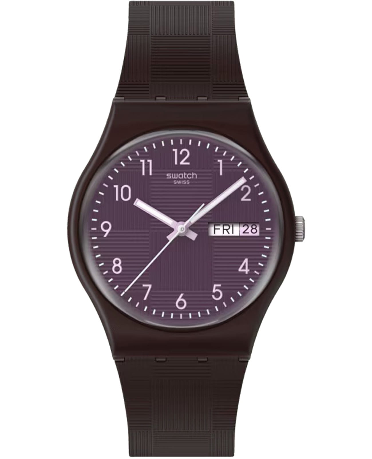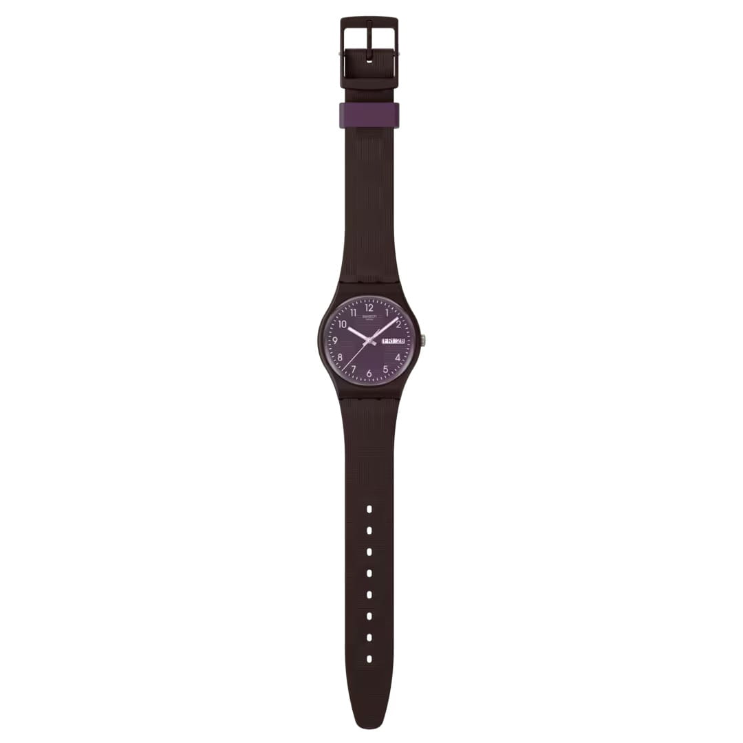 Женские наручные часы Swatch WEAVING WONDERS SO28C700 — это стильный и современный аксессуар для тех, кто ценит лёгкость и комфорт. Корпус выполнен из пластика, диаметром 34 мм и толщиной 8,75 мм, что обеспечивает долговечность и утончённый внешний вид. Циферблат защищён органическим стеклом, устойчивым к повреждениям. Модель оснащена кварцевым механизмом, обеспечивающим высокую точность хода. Часовая и минутная стрелки с люминесцентным покрытиемЛюминесцентное покрытиеПозволяет считывать показания времени в темноте. Производители наносят на стрелки, часовые индексы, безель или поверхность циферблата светонакопительный состав, дающий холодное свечение. и окошком дня недели и даты в положении «3 часа». Силиконовый текстурированный матово-фиолетовый ремешок на стандартной застёжке гармонично дополняет корпус и обеспечивает комфортное ношение. Водозащита 30 метров позволит защитить корпус от случайных брызг или капель дождя. Эти часы подойдут для повседневного ношения и станут ярким акцентом в вашем наряде.
