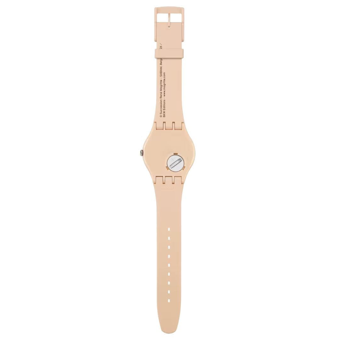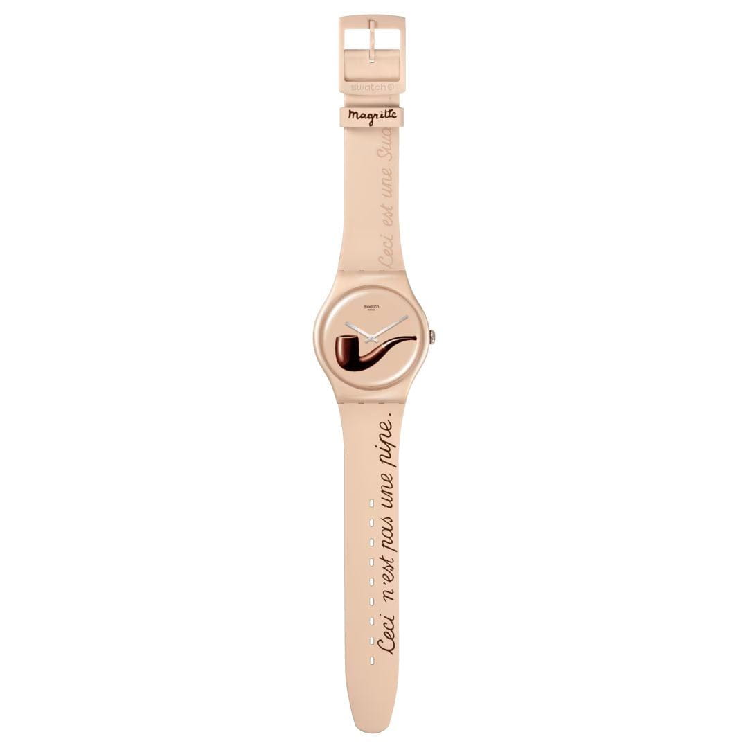 Часы Swatch SO29Z124 — стильный и надежный аксессуар. Оформление этих часов включает детали культового произведения сюрреалистического художника Рене Магритта "La Trahison des images" (Предательство образов), напечатанные на бежевом циферблате. На передней части ремешка подчеркивается сюрреалистическая природа его творчества фразой: "Ceci n'est pas une pipe. Ceci est une Swatch." ("Это не трубка. Это Swatch."). На петле также напечатано имя художника. Циферблат покрыт биостеклом. Ремешок силиконовый на классической застежке. Внутри часов установлен надежный кварцевый механизм, который обеспечивает точность хода. Эти часы водонепроницаемы до 30 метров, что позволяет не беспокоиться о случайных брызгах или дождевых каплях. Swatch SO29Z124 — это идеальный выбор для тех, кто ценит сочетание стиля, комфорта и функциональности в одном аксессуаре.