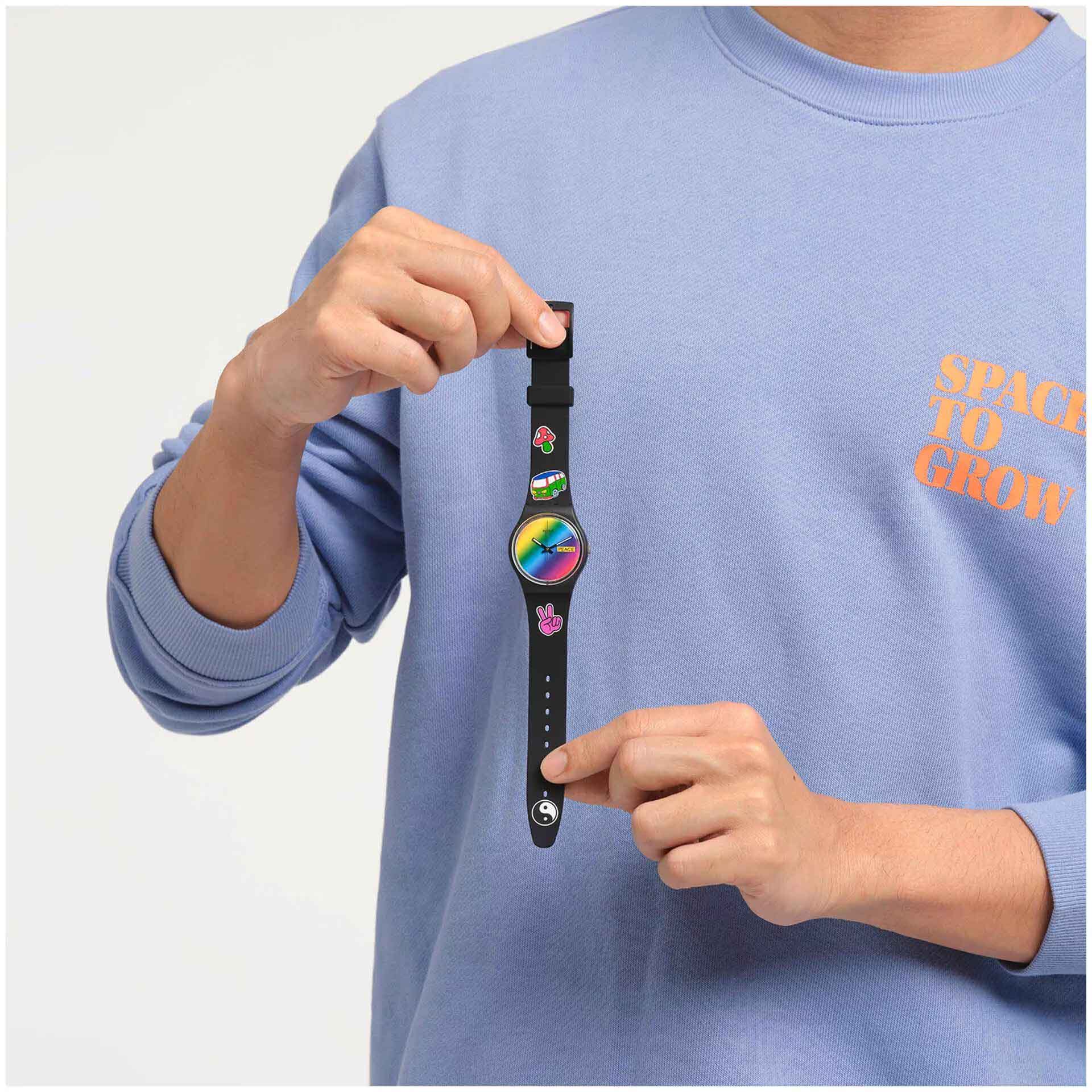 Часы Swatch SO31B101 — стильный и удобный аксессуар. Кварцевые часы с корпусом из биокерамики. Эти часы с радужным градиентом полностью вдохновлены стилем 60-х годов: они имеют корпус из черной биокерамики, стекло из биоматериала, черный силиконовый ремешок с многоцветными напечатанными символами и циферблат с радужным принтом. Слово "Мир" заменяет окно даты на этих часах. Часовая и минутная стрелки - с люминесцентным покрытиемЛюминесцентное покрытиеПозволяет считывать показания времени в темноте. Производители наносят на стрелки, часовые индексы, безель или поверхность циферблата светонакопительный состав, дающий холодное свечение., светятся в темноте. Ремешок силиконовый на стандартной застёжке. Внутри часов установлен надежный кварцевый механизм, который обеспечивает точность хода. Эти часы водонепроницаемы до 30 метров, что позволяет не беспокоиться о случайных брызгах или дождевых каплях. Swatch SO31B101 — это идеальный выбор для тех, кто ценит сочетание стиля, комфорта и функциональности в одном аксессуаре.