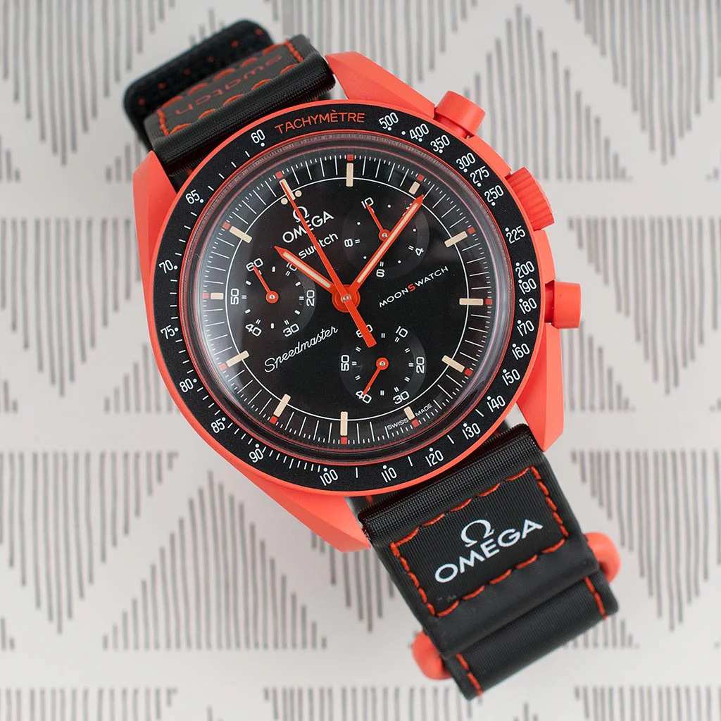 Швейцарские мужские часы Swatch x Omega Bioceramic Moonswatch Mission on Earth: Lava SO33O100 с хронографом