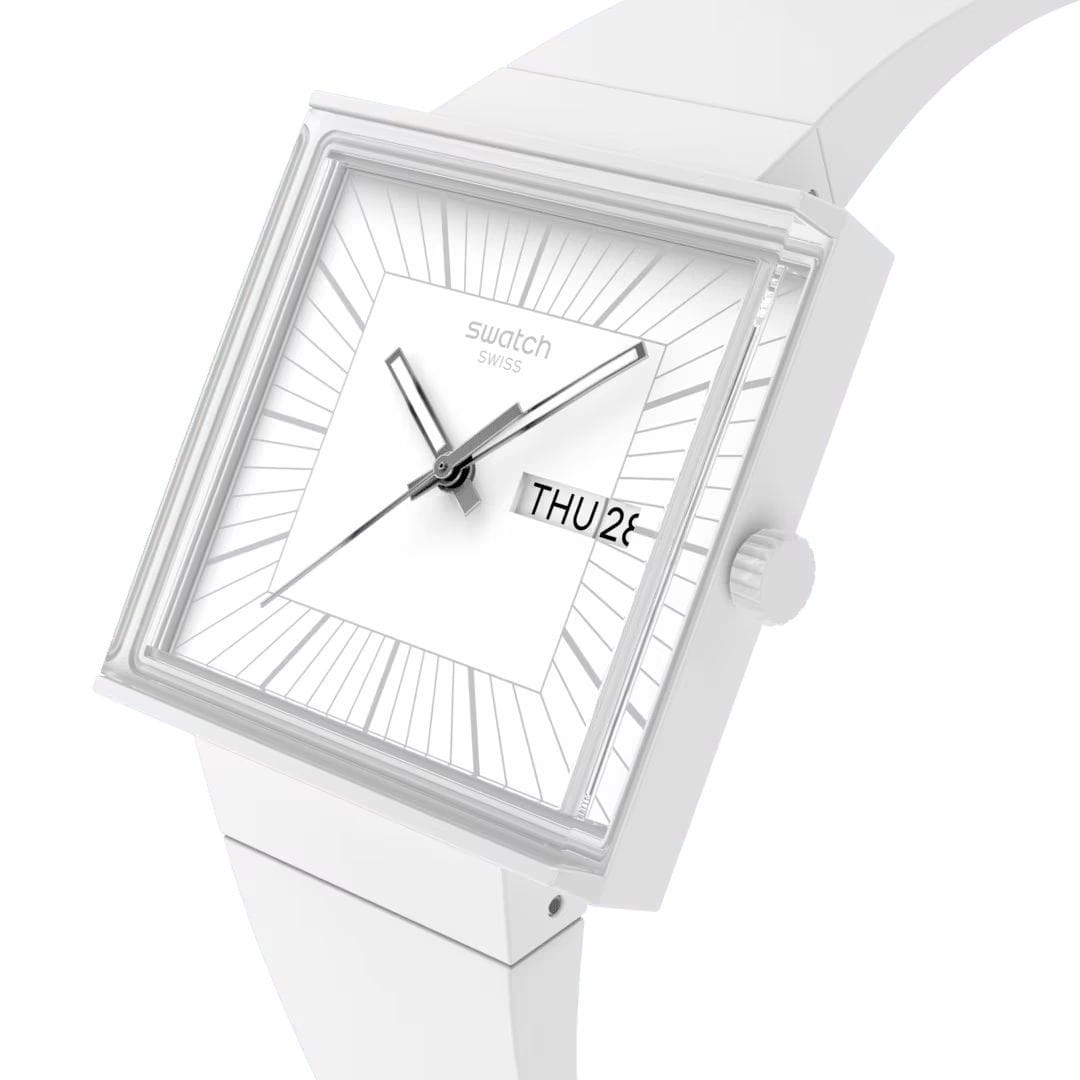 Swatch Square Bioceramic Standard SO34W700 "WHAT IF...ALLWHITE?" - это стильные квадратные часы с корпусом 41,8*41,8 мм из матовой биокерамики белого цвета. Модель оснащена кварцевым механизмом, окошком даты и дня недели, водонепроницаемостью до 20 метров. Часы имеют белый матовый ремешок из биоматериала, белый циферблат и стекло из биоматериала. Стрелки с люминесцентным покрытиемЛюминесцентное покрытиеПозволяет считывать показания времени в темноте. Производители наносят на стрелки, часовые индексы, безель или поверхность циферблата светонакопительный состав, дающий холодное свечение.. Эта экологичная модель унисекс сочетает инновационные материалы с необычным полностью белым дизайном с серебристыми индексами и стрелками, вдохновленным оригинальным Swatch 1983 года, и подходит для тех, кто ценит минимализм и заботу об окружающей среде.