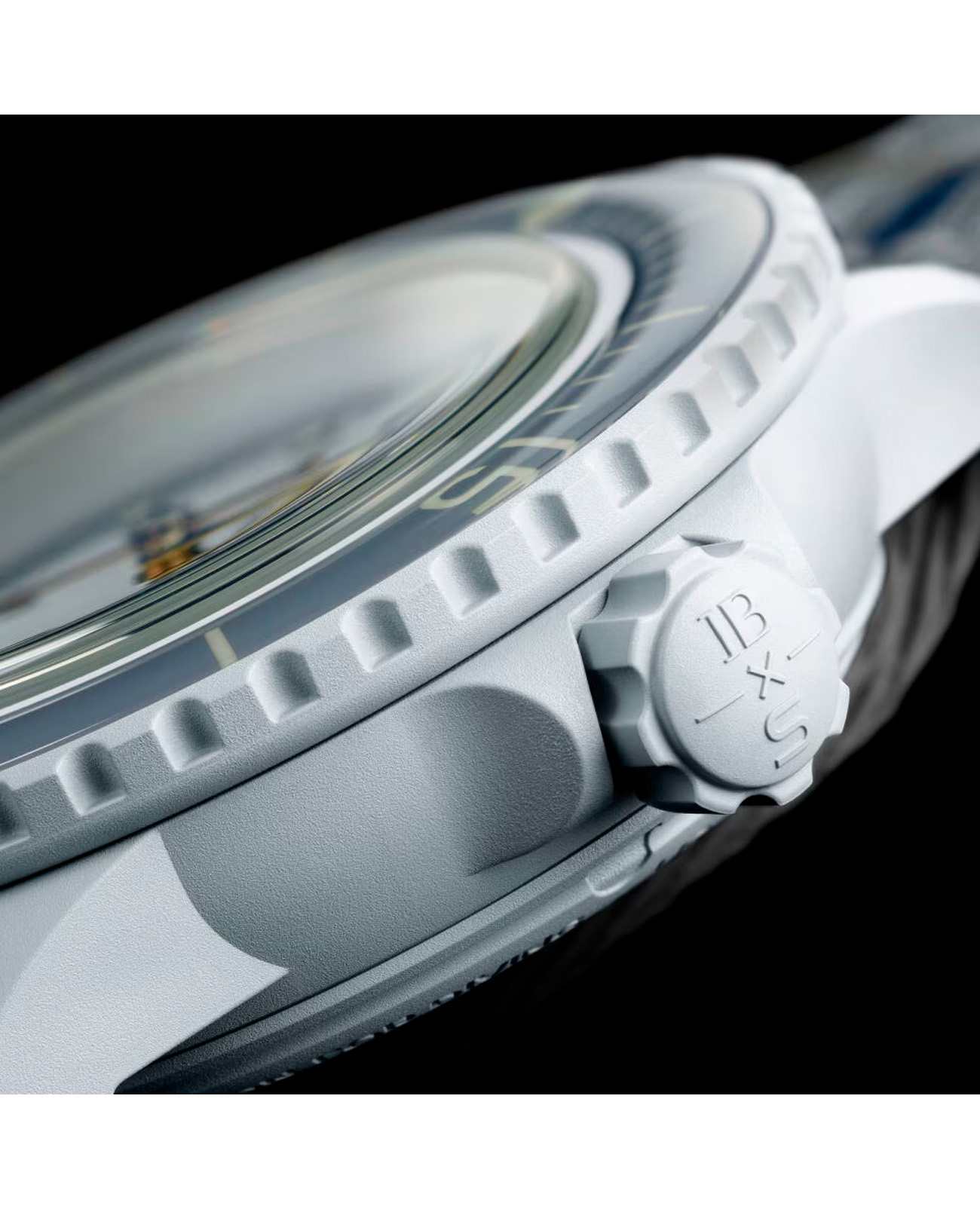 Наручные часы сочетают в себе современный дизайн и инновационные технологии. Модель обладает круглым корпусом диаметром 42,3 мм, изготовленным из биокерамикиБиокерамикаБиокерамика — это материал, который на две трети состоит из керамики, на одну треть — из биопластика. Он сочетает в себе лучшие качества обоих материалов и обладает прочностью и шелковистой на ощупь текстурой., что обеспечивает высокую прочность и устойчивость к внешним воздействиям . Толщина корпуса составляет 14,4 мм, а расстояние между ушками — 48,0 мм, что делает часы удобными для повседневного использования. Ремешок выполнен из ткани в стиле ремешка NATOРемешок NATOРемешок NATO — это прочный, универсальный и сменный часовой ремешок, изначально созданный для военных. Он изготовлен из нейлона или другого прочного материала и имеет уникальную конструкцию, которая позволяет часам оставаться на запястье даже в случае поломки одной из прикрепляющих точек. , гарантируя комфортное ношение и долговечность . Серый циферблат дополнен люминесцентными метками и арабскими цифрами, что обеспечивает четкость считывания времени в любых условиях . Для защиты используется органическое стекло, обеспечивающее надежную защиту от царапин и механических повреждений . Часы работают на автоматическом механизме Sistem51, что гарантирует точность хода без необходимости регулярной подзаводки . Водонепроницаемость часов достигает 100 метров, что позволяет использовать их в повседневных условиях, однако не рекомендуется погружение на большую глубину . Дополнительные элементы дизайна, такие как заводная головка и кнопки-пушеры, выполненные из биокерамикиБиокерамикаБиокерамика — это материал, который на две трети состоит из керамики, на одну треть — из биопластика. Он сочетает в себе лучшие качества обоих материалов и обладает прочностью и шелковистой на ощупь текстурой., завершают образ этих стильных и функциональных часов.
