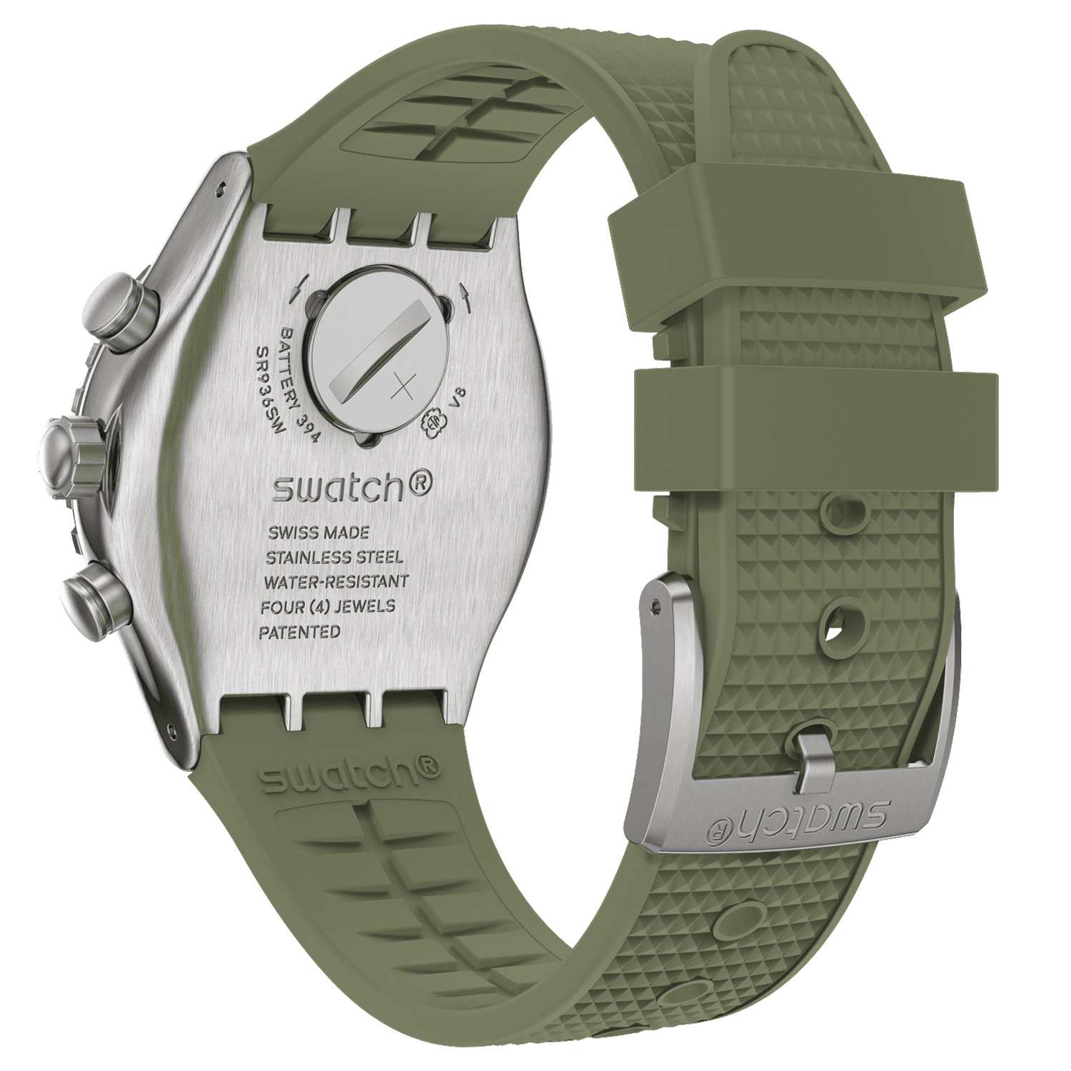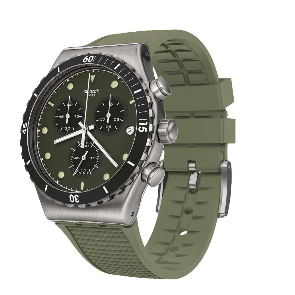 Часы Swatch YVS488 — это стильный и современный аксессуар для тех, кто ценит лёгкость и комфорт. Эта стильная модель часов из нержавеющей стали дополнена зеленым каучуковым ремешком с фактурным верхом и матовой застежкой из нержавеющей стали. Но изюминка этих часов — матовый зеленый циферблат с черными счетчиками хронографаХронографФункция позволяет измерять отрезки времени с особой точностью: часы, минуты, секунды. Верным признаком хронографа является наличие на циферблате 3 дополнительных окошек-счётчиков., индексами и стрелками с люминесцентным покрытиемЛюминесцентное покрытиеПозволяет считывать показания времени в темноте. Производители наносят на стрелки, часовые индексы, безель или поверхность циферблата светонакопительный состав, дающий холодное свечение.. Завершают образ индикатор даты в положении «3 часа» на циферблате, а также серебристые цифры и индексы на безелеБезельВнешний ободок, закрепляющий стекло. В спортивных часах так называется поворотное кольцо с делениями на циферблате, выполняет роль таймера – замеряет отрезки времени на шкале. Неподвижный безель – элемент декора. Однонаправленно вращающийся безель на дайверских часах позволяет фиксировать моменты погружения и выныривания на поверхность. из нержавеющей стали с черным PVDPVDУльтратонкое покрытие наносится в технике вакуумного напыления, сочетает в себе нитрид титана особой прочности со слоем золота или оксида хрома. Несёт в себе декоративную или защитную функцию. покрытием. Водозащита 30 метров делает часы практичными для повседневного использования. Эти часы подойдут для повседневного ношения и станут ярким акцентом в вашем наряде.