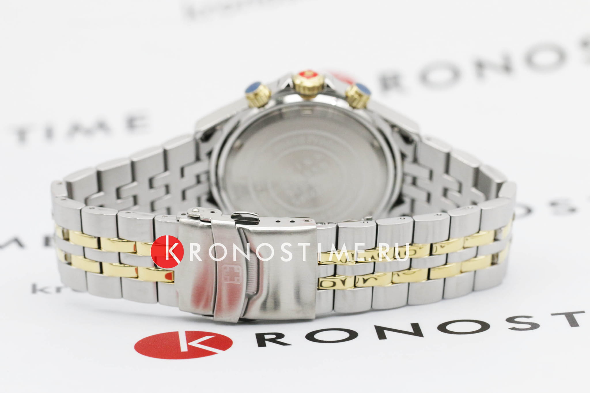 Мужские швейцарские часы-хронографХронографФункция позволяет измерять отрезки времени с особой точностью: часы, минуты, секунды. Верным признаком хронографа является наличие на циферблате 3 дополнительных окошек-счётчиков. с секундомеромСекундомерСекундоме́р — прибор, способный измерять интервалы времени с точностью до долей секунды. Swiss Military Hanowa Flagship X Chrono SMWGI2100760, кварцевый механизм с высокой точностью. Сапфировое стеклоСапфировое стеклоПрочный и надёжный материал из кристалла сапфира синтетического происхождения, характеризующийся особой твёрдостью и устойчивостью к царапинам и повреждениям. устойчивое к появлению царапин, обладающее высокой прозрачностью. Класс водозащиты: 100 метров, позволит плавать, нырять и заниматься другими водными видами спорта. Корпус часов изготовлен из стали с IP-покрытиемIP-покрытиеМетод ионного напыления. Демонстрирует повышенную устойчивость к истиранию, окислению и химическим веществам. Под воздействием высокого давления и температуры около 1500°C молекулы металла надёжно соединяются с частицами корпуса часов. цвета желтое золото. Неподвижный безельБезельВнешний ободок, закрепляющий стекло. В спортивных часах так называется поворотное кольцо с делениями на циферблате, выполняет роль таймера – замеряет отрезки времени на шкале. Неподвижный безель – элемент декора. Однонаправленно вращающийся безель на дайверских часах позволяет фиксировать моменты погружения и выныривания на поверхность. из нержавеющей стали с IP-покрытиемIP-покрытиеМетод ионного напыления. Демонстрирует повышенную устойчивость к истиранию, окислению и химическим веществам. Под воздействием высокого давления и температуры около 1500°C молекулы металла надёжно соединяются с частицами корпуса часов..