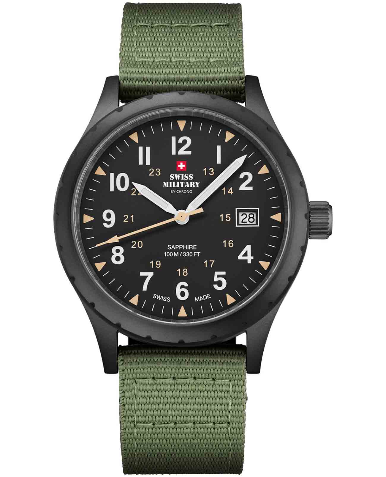 Модель SM34108.07 от Swiss Military by Chrono — это надёжные швейцарские часы в классическом армейском стиле, сочетающие функциональность и сдержанный дизайн. Корпус выполнен из нержавеющей стали с PVD-покрытиемPVDУльтратонкое покрытие наносится в технике вакуумного напыления, сочетает в себе нитрид титана особой прочности со слоем золота или оксида хрома. Несёт в себе декоративную или защитную функцию., подчёркивая прочность и элегантность конструкции. Циферблат с арабскими цифрами обеспечивает отличную читаемость, а функция отображения даты добавляет практичности. Часы оснащены кварцевым механизмом, обеспечивающим точный ход. Циферблат защищён сапфировым стекломСапфировое стеклоПрочный и надёжный материал из кристалла сапфира синтетического происхождения, характеризующийся особой твёрдостью и устойчивостью к царапинам и повреждениям., устойчивым к царапинам. Тканевый ремешок на стандартной застежке для надёжной фиксации на запястье. Модель обладает водонепроницаемостью до 100 метров, что делает её подходящей для плавания и сноркелинга.