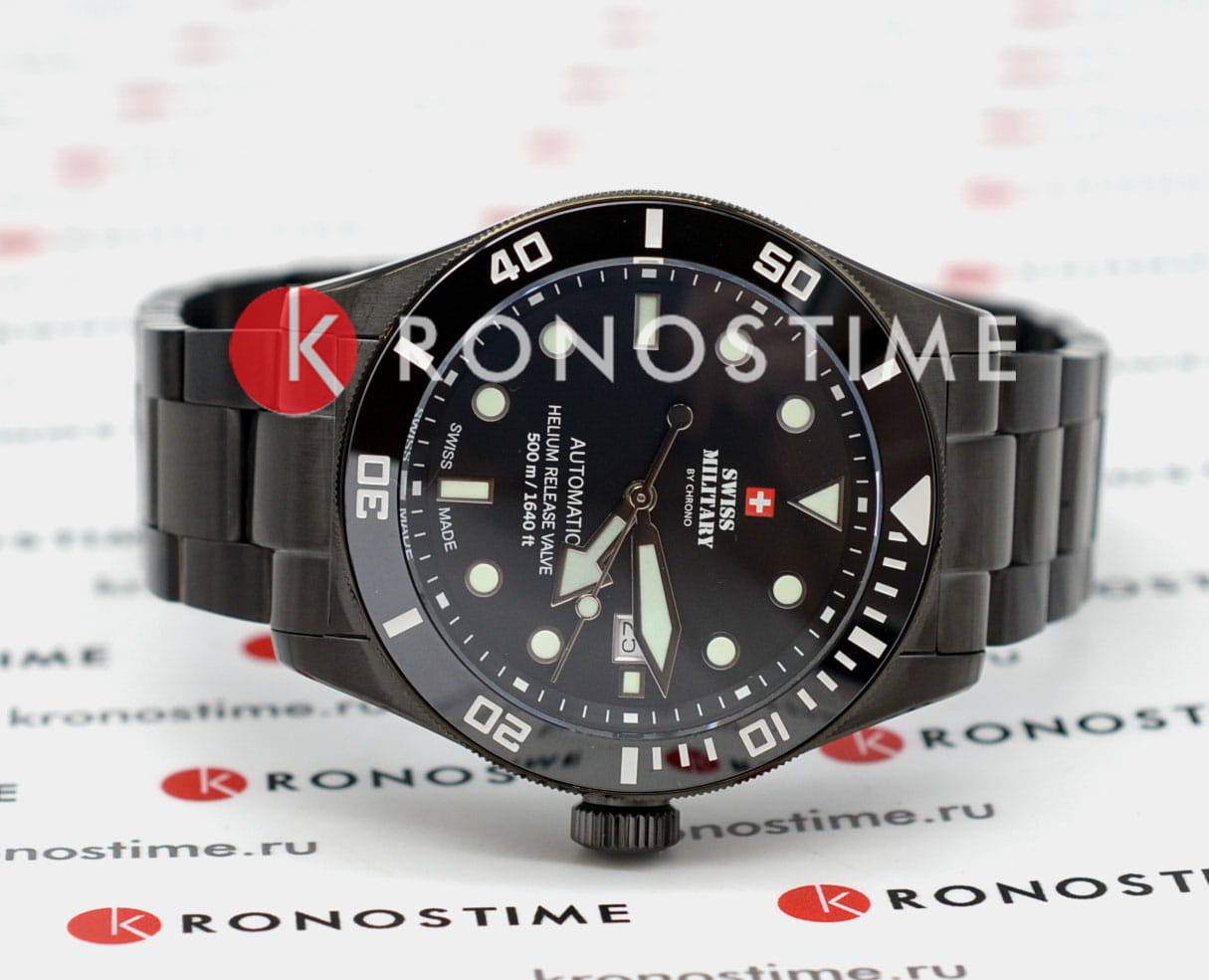 Мужские швейцарские наручные часы Swiss Military by Chrono Diver SMA34075.04, механический механизм (автоматический калибр) с высокой точностью. Сапфировое стекло устойчивое к появлению царапин, обладающее высокой прозрачностью.Корпус часов изготовлен из стали, черного цвета.