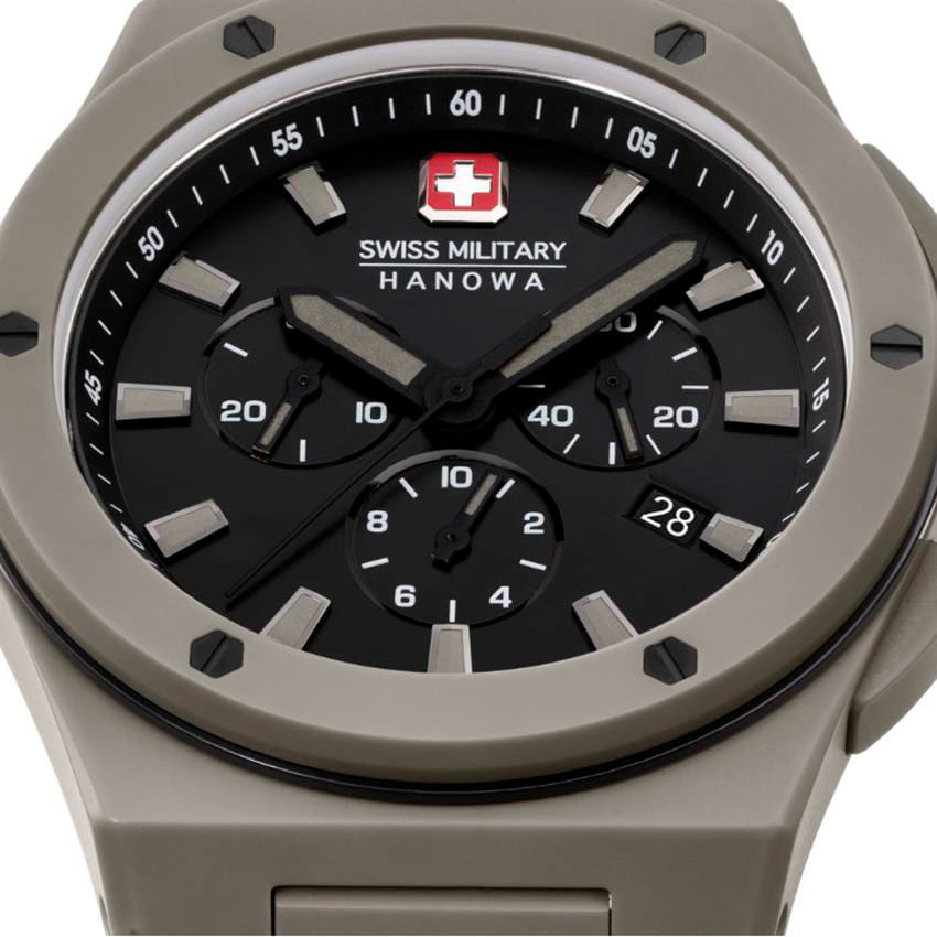 Мужские швейцарские часы с хронографомХронографФункция позволяет измерять отрезки времени с особой точностью: часы, минуты, секунды. Верным признаком хронографа является наличие на циферблате 3 дополнительных окошек-счётчиков. Swiss Military Hanowa Sidewinder Ceramic SMWGI0002285 станут отличным выбором для тех, кто ценит стильный дизайн и функциональность в одном аксессуаре. Корпус диаметром 43 мм сбалансирован и элегантен. Сапфировое стеклоСапфировое стеклоПрочный и надёжный материал из кристалла сапфира синтетического происхождения, характеризующийся особой твёрдостью и устойчивостью к царапинам и повреждениям. с антибликовым покрытием защищает циферблат от царапин и обеспечивает отличную читаемость при любом освещении. Керамический браслет с застежкой бабочкаЗастёжка "бабочка"Такой вид застёжки дополняется предохранителями, помогающими избежать случайного раскрытия браслета. Обладают изящным исполнением. идеально дополняют дизайн часов, обеспечивая комфортное ношение. Люминесцентное покрытиеЛюминесцентное покрытиеПозволяет считывать показания времени в темноте. Производители наносят на стрелки, часовые индексы, безель или поверхность циферблата светонакопительный состав, дающий холодное свечение. стрелок и меток позволит вам следить за временем даже в полной темноте. Метки выполнены в виде штрихов. Окошко даты в положении 4 часа.