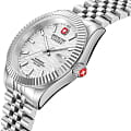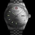 Часы Swiss Military Hanowa Master Diligenter SMWGL0005402 — это образец швейцарской точности и изысканного стиля. Эти механические часы с автоподзаводом оснащены калибром Soprod P024, который обеспечивает надежную работу механизма. Запас хода составляет 38 часов, что гарантирует их бесперебойное функционирование. Элегантный корпус диаметром 41 мм и толщиной 11 мм выполнен из прочной стали и украшен рифленым безелемБезельВнешний ободок, закрепляющий стекло. В спортивных часах так называется поворотное кольцо с делениями на циферблате, выполняет роль таймера – замеряет отрезки времени на шкале. Неподвижный безель – элемент декора. Однонаправленно вращающийся безель на дайверских часах позволяет фиксировать моменты погружения и выныривания на поверхность.. Серебристый текстурированный циферблат защищен  сапфировым стекломСапфировое стеклоПрочный и надёжный материал из кристалла сапфира синтетического происхождения, характеризующийся особой твёрдостью и устойчивостью к царапинам и повреждениям., которое устойчиво к царапинам и сохраняет безупречный вид. Метки в виде штрихов и стрелки имеют люминесцентное покрытиеЛюминесцентное покрытиеПозволяет считывать показания времени в темноте. Производители наносят на стрелки, часовые индексы, безель или поверхность циферблата светонакопительный состав, дающий холодное свечение., которое обеспечивает видимость в темноте после кратковременной зарядки на свету. Окошко даты с увеличительным стеклом расположено в положении 3 часа, а фирменный логотип Swiss Military Hanowa находится в позиции 12 часов. Заводная головка с рифлением украшена фирменным логотипом, добавляя часам изысканный акцент. Прозрачная задняя крышка позволяет наблюдать за работой механизма, подчеркивая внимание к деталям. Завершает образ стальной браслет с раскладной застёжкойРаскладная застёжкаТакой тип застёжки используется только на браслетах из металла. Она никогда не раскрывается полностью, происходит разделение на 2 и более частей. Раскладывающая застёжка снизит вероятность потери часов к минимуму., который удобно сидит на запястье и обеспечивает надежную фиксацию. Часы обладают водозащитой уровня 100WR, что делает их подходящими для повседневного использования и активного образа жизни.