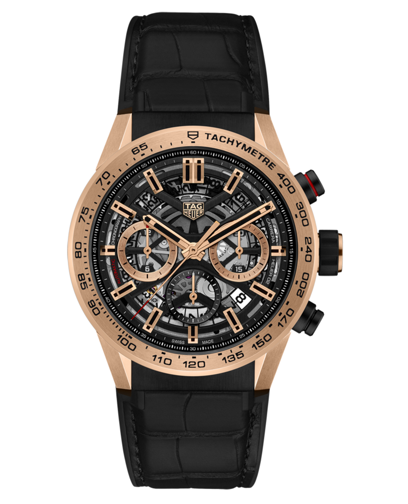 Автоматический хронограф черного цвета с заводной головкой, кнопками, безелем с тахиметрической шкалой, элементами циферблата и креплениями ремешка из розового золота. Корпус диаметром 43 мм из стали с черным PVD-покрытием дополняет черный матовый ремешок из кожи аллигатора и каучука, выдержанный в гоночной стилистике. TAG Heuer Carrera CBG2051.FC6426, механический механизм (автоматический калибр) с высокой точностью. Сапфировое стекло устойчивое к появлению царапин, обладающее высокой прозрачностью. Класс водозащиты: 100 метров, позволит плавать, нырять и заниматься другими водными видами спорта. Корпус часов изготовлен из стали, цвета.