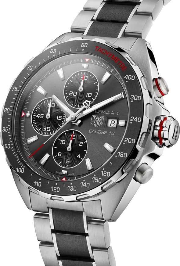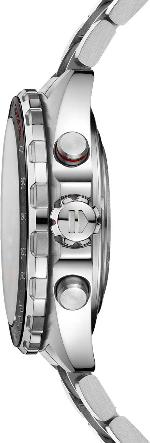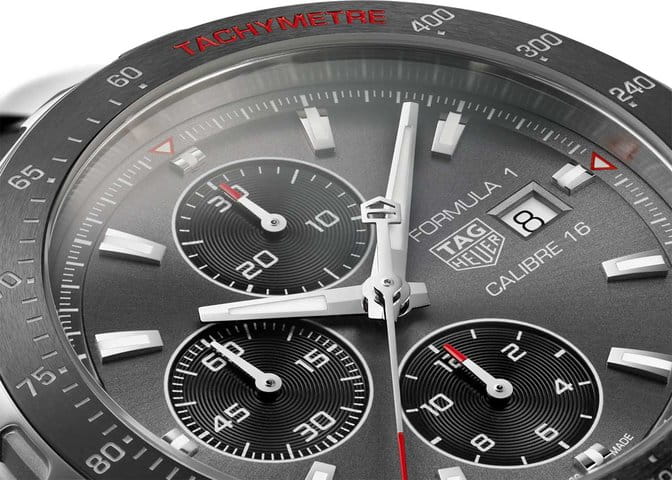 Мужские механические часы TAG Heuer Formula 1 Chronograph CAZ2012.BA0970 — это стильное сочетание элегантности и современного дизайна. Корпус из нержавеющей стали диаметром 44 мм идеально сбалансирован и элегантен. Сапфировое стеклоСапфировое стеклоПрочный и надёжный материал из кристалла сапфира синтетического происхождения, характеризующийся особой твёрдостью и устойчивостью к царапинам и повреждениям. с антибликовым покрытием защищает циферблат от царапин и обеспечивает отличную читаемость при любом освещении. Стальной браслет на раскладной застёжкеРаскладная застёжкаТакой тип застёжки используется только на браслетах из металла. Она никогда не раскрывается полностью, происходит разделение на 2 и более частей. Раскладывающая застёжка снизит вероятность потери часов к минимуму. идеально дополняют дизайн часов, обеспечивая комфортное ношение. Стрелки и метки на циферблате имеют люминесцентное покрытиеЛюминесцентное покрытиеПозволяет считывать показания времени в темноте. Производители наносят на стрелки, часовые индексы, безель или поверхность циферблата светонакопительный состав, дающий холодное свечение. позволяющее легко определять время даже в темноте. БезельБезельВнешний ободок, закрепляющий стекло. В спортивных часах так называется поворотное кольцо с делениями на циферблате, выполняет роль таймера – замеряет отрезки времени на шкале. Неподвижный безель – элемент декора. Однонаправленно вращающийся безель на дайверских часах позволяет фиксировать моменты погружения и выныривания на поверхность. тахиметраТахиметрРазмеченная шкала, располагается на ободке или безеле часов. Тахиметр позволяет рассчитать скорость на определённом участке пути, расстояние измеряется в километрах или милях. подчёркивает спортивное наследие часов. Часы обладают впечатляющей водонепроницаемостью до 20 бар (200 метров), что делает их идеальными для плавания, ныряния и погружений с аквалангом. Автоматический хронографХронографФункция позволяет измерять отрезки времени с особой точностью: часы, минуты, секунды. Верным признаком хронографа является наличие на циферблате 3 дополнительных окошек-счётчиков. обеспечивает точное измерение времени на каждом круге. Запас хода до 42 часов. Завинчивающаяся задняя крышка украшена специальным узором «клетка». Прочная конструкция часов и высокопроизводительный механизм делают их идеальным спутником для любителей гонок.