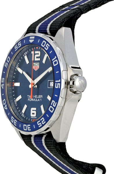 Мужские швейцарские наручные кварцевые часы TAG Heuer Formula 1 WAZ1010.FC8197. Сапфировое стеклоСапфировое стеклоПрочный и надёжный материал из кристалла сапфира синтетического происхождения, характеризующийся особой твёрдостью и устойчивостью к царапинам и повреждениям. устойчивое к появлению царапин, обладающее высокой прозрачностью. Стрелки и метки с люминесцентным покрытиемЛюминесцентное покрытиеПозволяет считывать показания времени в темноте. Производители наносят на стрелки, часовые индексы, безель или поверхность циферблата светонакопительный состав, дающий холодное свечение.. Класс водозащиты: 200 метров, позволит плавать, нырять и заниматься другими водными видами спорта. Корпус часов изготовлен из стали. Вращающийся стальной безельБезельВнешний ободок, закрепляющий стекло. В спортивных часах так называется поворотное кольцо с делениями на циферблате, выполняет роль таймера – замеряет отрезки времени на шкале. Неподвижный безель – элемент декора. Однонаправленно вращающийся безель на дайверских часах позволяет фиксировать моменты погружения и выныривания на поверхность. с PVD-покрытиемPVDУльтратонкое покрытие наносится в технике вакуумного напыления, сочетает в себе нитрид титана особой прочности со слоем золота или оксида хрома. Несёт в себе декоративную или защитную функцию.. Тканевый ремешок на стандартной застёжке. Окошко даты находится в положении 3 часа.