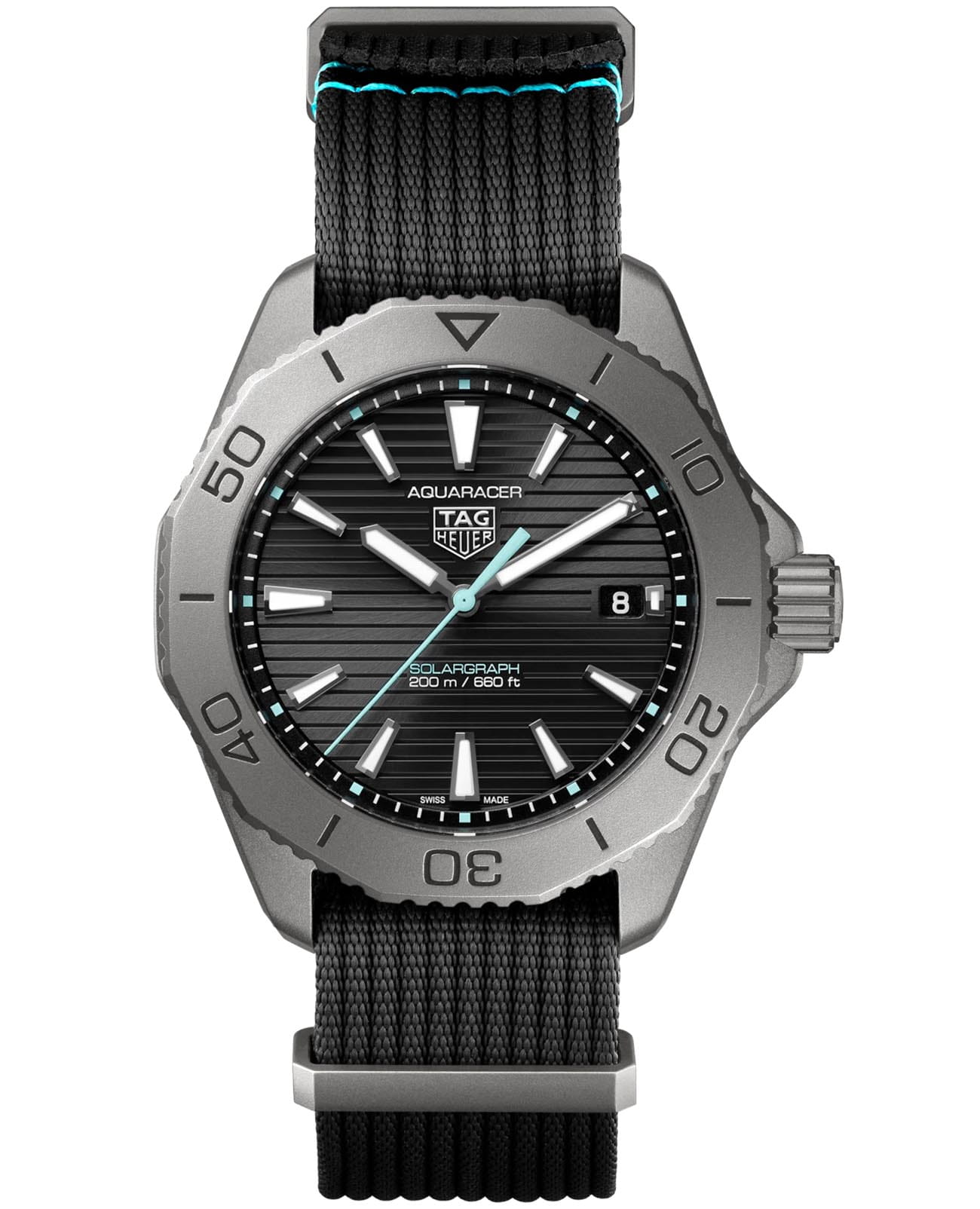 TAG Heuer Aquaracer Professional 200 Solargraph WBP1180.FN8027 - это новый взгляд на часы, созданные для активного отдыха. Созданы для покорения стихий, объединяет впечатляющую прочность и механизм, работающий на солнечной энергии. Кварцевый механизм с высокой точностью калибр TH50-00. Титановый корпус диаметром 40 мм, с акцентами навеянными ледовыми пейзажами, рассчитан на активную эксплуатацию в природных условиях – идеальный выбор для тех, кто стремится выйти за пределы возможного. Сапфировое стеклоСапфировое стеклоПрочный и надёжный материал из кристалла сапфира синтетического происхождения, характеризующийся особой твёрдостью и устойчивостью к царапинам и повреждениям. устойчивое к появлению царапин, обладающее высокой прозрачностью. Стрелки и метки с люминесцентным покрытиемЛюминесцентное покрытиеПозволяет считывать показания времени в темноте. Производители наносят на стрелки, часовые индексы, безель или поверхность циферблата светонакопительный состав, дающий холодное свечение. позволяет видеть в темноте. Окошко даты находится в положении 3 часа. Вращающийся безельБезельВнешний ободок, закрепляющий стекло. В спортивных часах так называется поворотное кольцо с делениями на циферблате, выполняет роль таймера – замеряет отрезки времени на шкале. Неподвижный безель – элемент декора. Однонаправленно вращающийся безель на дайверских часах позволяет фиксировать моменты погружения и выныривания на поверхность. из титана серого цвета. Тканевый ремешок на стандартной застежке обеспечивает комфортное ношение. Класс водозащиты: 200 метров, позволит плавать, нырять и заниматься другими водными видами спорта.