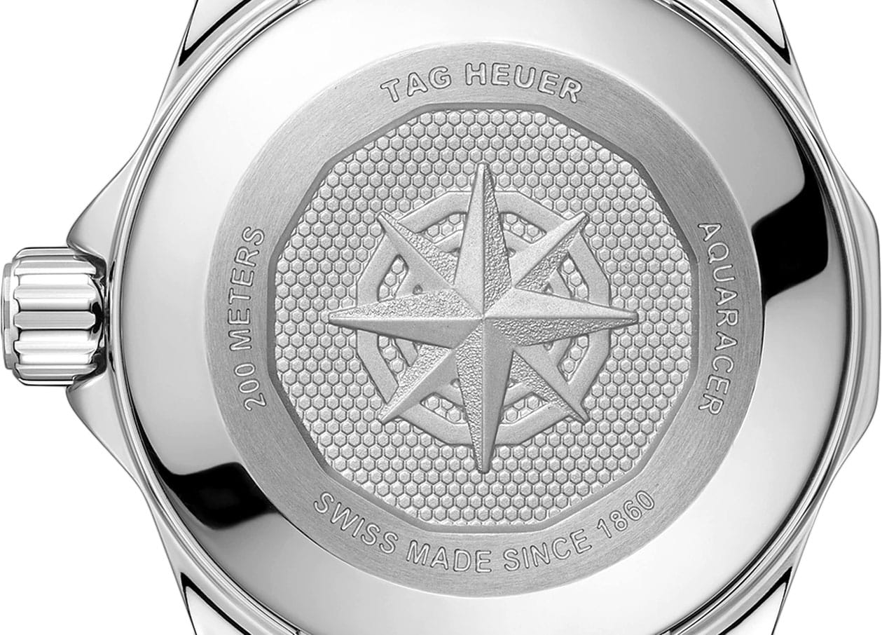 Женские швейцарские часы TAG Heuer Aquaracer Professional 200 WBP1410.BA0622, кварцевый механизм с высокой точностью. Сапфировое стеклоСапфировое стеклоПрочный и надёжный материал из кристалла сапфира синтетического происхождения, характеризующийся особой твёрдостью и устойчивостью к царапинам и повреждениям. устойчивое к появлению царапин, обладающее высокой прозрачностью. Класс водозащиты: 200 метров, позволит плавать, нырять и заниматься другими водными видами спорта. Корпус часов изготовлен из стали. Стальной браслет на раскладной застёжкеРаскладная застёжкаТакой тип застёжки используется только на браслетах из металла. Она никогда не раскрывается полностью, происходит разделение на 2 и более частей. Раскладывающая застёжка снизит вероятность потери часов к минимуму.. Стальной рифленый вращающийся 12-гранный безельБезельВнешний ободок, закрепляющий стекло. В спортивных часах так называется поворотное кольцо с делениями на циферблате, выполняет роль таймера – замеряет отрезки времени на шкале. Неподвижный безель – элемент декора. Однонаправленно вращающийся безель на дайверских часах позволяет фиксировать моменты погружения и выныривания на поверхность. с минутной шкалой выполнен с радиальным сатинированием поверхности. Циферблат выполнен по технологии Sunray (солнечные лучи). Метки в виде штрихов. Стрелки и метки с родиевым и люминесцентным покрытиемЛюминесцентное покрытиеПозволяет считывать показания времени в темноте. Производители наносят на стрелки, часовые индексы, безель или поверхность циферблата светонакопительный состав, дающий холодное свечение. Superluminova. Рифленая заводная головка с защитой. Задняя крышка украшена выгравированной 8-лучевой розой ветров на фоне узора сотовой структуры.