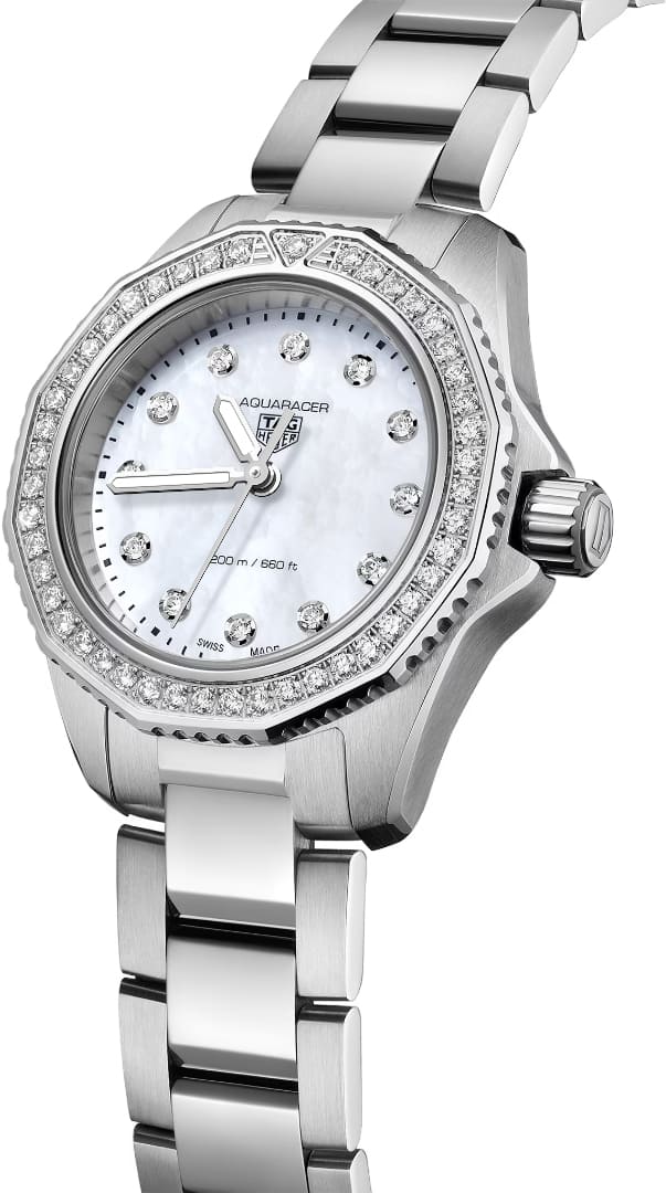 Женские швейцарские часы TAG Heuer Aquaracer Professional 200 WBP1417.BA0622, кварцевый механизм с высокой точностью. Сапфировое стеклоСапфировое стеклоПрочный и надёжный материал из кристалла сапфира синтетического происхождения, характеризующийся особой твёрдостью и устойчивостью к царапинам и повреждениям. устойчивое к появлению царапин, обладающее высокой прозрачностью. Класс водозащиты: 200 метров, позволит плавать, нырять и заниматься другими водными видами спорта. Корпус часов изготовлен из стали. Стальной браслет на раскладной застёжкеРаскладная застёжкаТакой тип застёжки используется только на браслетах из металла. Она никогда не раскрывается полностью, происходит разделение на 2 и более частей. Раскладывающая застёжка снизит вероятность потери часов к минимуму.. Стальной рифленый вращающийся 12-гранный безельБезельВнешний ободок, закрепляющий стекло. В спортивных часах так называется поворотное кольцо с делениями на циферблате, выполняет роль таймера – замеряет отрезки времени на шкале. Неподвижный безель – элемент декора. Однонаправленно вращающийся безель на дайверских часах позволяет фиксировать моменты погружения и выныривания на поверхность. с минутной шкалой выполнен с радиальным сатинированием поверхности. Перламутровый циферблат украшен 12-ю бриллиантами. Прямоугольные стрелки в стиле Baton с люминесцентным покрытиемЛюминесцентное покрытиеПозволяет считывать показания времени в темноте. Производители наносят на стрелки, часовые индексы, безель или поверхность циферблата светонакопительный состав, дающий холодное свечение. Superluminova. Рифленая заводная головка с защитой. Задняя крышка украшена выгравированной 8-лучевой розой ветров на фоне узора сотовой структуры. БезельБезельВнешний ободок, закрепляющий стекло. В спортивных часах так называется поворотное кольцо с делениями на циферблате, выполняет роль таймера – замеряет отрезки времени на шкале. Неподвижный безель – элемент декора. Однонаправленно вращающийся безель на дайверских часах позволяет фиксировать моменты погружения и выныривания на поверхность. и циферблат украшены бриллиантами 0,117К.