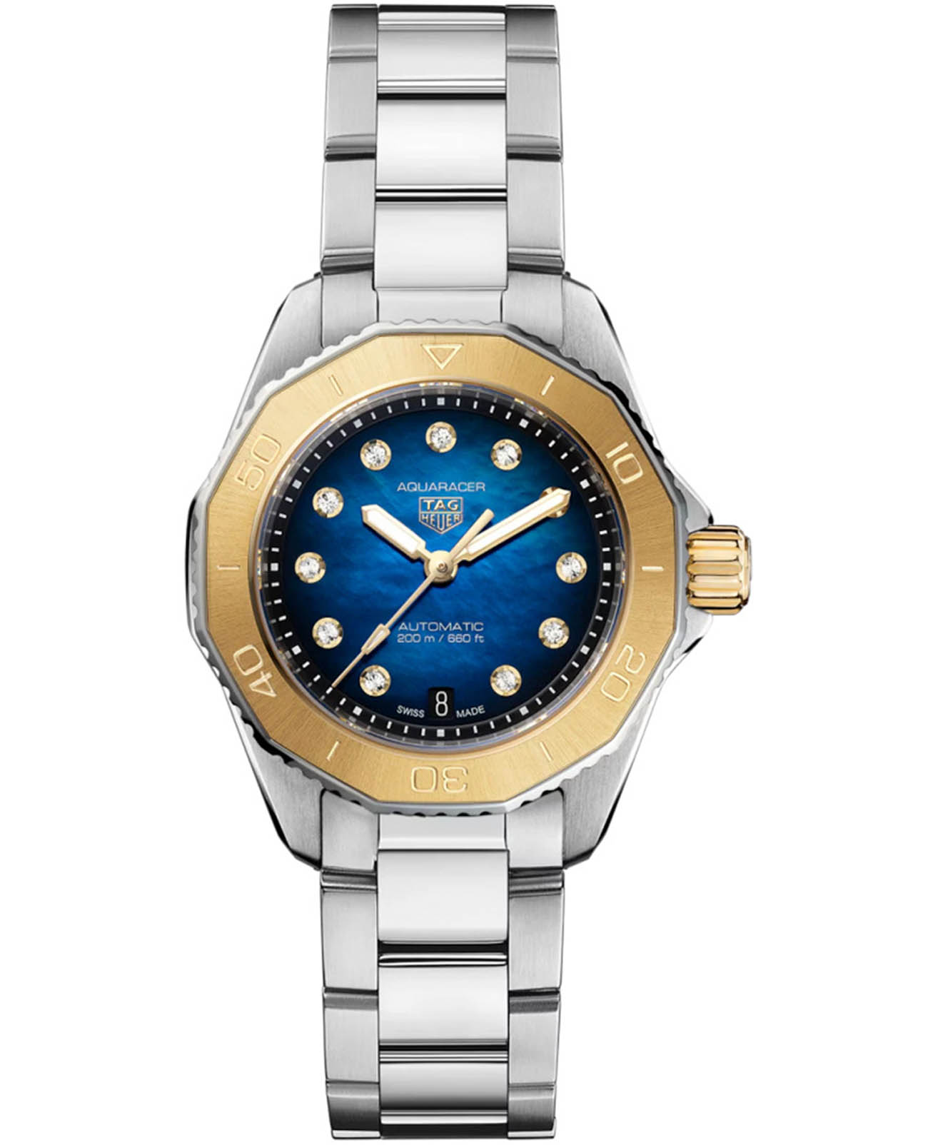 Женские механические швейцарские часы TAG Heuer Aquaracer Professional 200 Date WBP2450.BA0622 это стильный женский аксессуар, который сочетает элегантный дизайн и практичность. Механический механизм (автоматический калибр) с высокой точностью. Сапфировое стеклоСапфировое стеклоПрочный и надёжный материал из кристалла сапфира синтетического происхождения, характеризующийся особой твёрдостью и устойчивостью к царапинам и повреждениям. устойчивое к появлению царапин, обладающее высокой прозрачностью. Класс водозащиты: 200 метров, позволит плавать, нырять и заниматься другими водными видами спорта. Прочный корпус часов изготовлен из стали c безелемБезельВнешний ободок, закрепляющий стекло. В спортивных часах так называется поворотное кольцо с делениями на циферблате, выполняет роль таймера – замеряет отрезки времени на шкале. Неподвижный безель – элемент декора. Однонаправленно вращающийся безель на дайверских часах позволяет фиксировать моменты погружения и выныривания на поверхность. из стали с 18-каратным золотом18-каратное золотоОбозначение по каратной системе пробирования, оно показывает, сколько драгоценного металла содержится в изделии. 18 карат - в составе 75% чистого золота, соответствует 750 пробе.