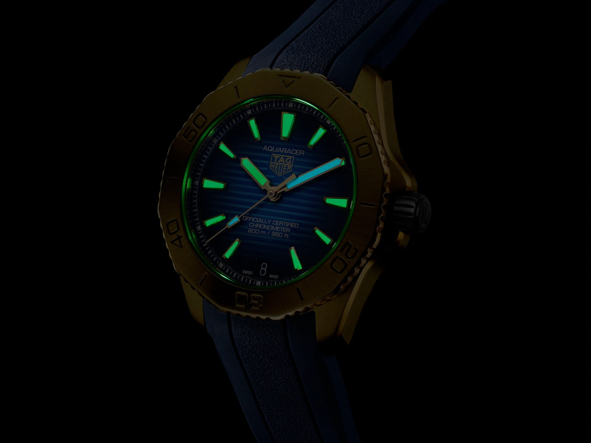 Изящный корпус этой модели TAG Heuer Aquaracer, выполненный из цельного желтого 18-каратного золото18-каратное золотоОбозначение по каратной системе пробирования, оно показывает, сколько драгоценного металла содержится в изделии. 18 карат - в составе 75% чистого золота, соответствует 750 пробе.
