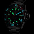 Мужские часы TAG Heuer Aquaracer Professional 200 Date WBP5A8A.BF0619 с 45-миллиметровым титановым корпусом оснащены защитой заводной головки и гелиевым выпускным клапаном, рассчитанным на погружение на глубину 1000 метров. Часы из титана, сертифицированные по стандарту ISO 6425:2018. Циферблат с люминесцентным покрытиемЛюминесцентное покрытиеПозволяет считывать показания времени в темноте. Производители наносят на стрелки, часовые индексы, безель или поверхность циферблата светонакопительный состав, дающий холодное свечение. стрелок и меток, дополнен сапфировым стекломСапфировое стеклоПрочный и надёжный материал из кристалла сапфира синтетического происхождения, характеризующийся особой твёрдостью и устойчивостью к царапинам и повреждениям., устойчивым к появлению царапин и обладающее высокой прозрачностью.