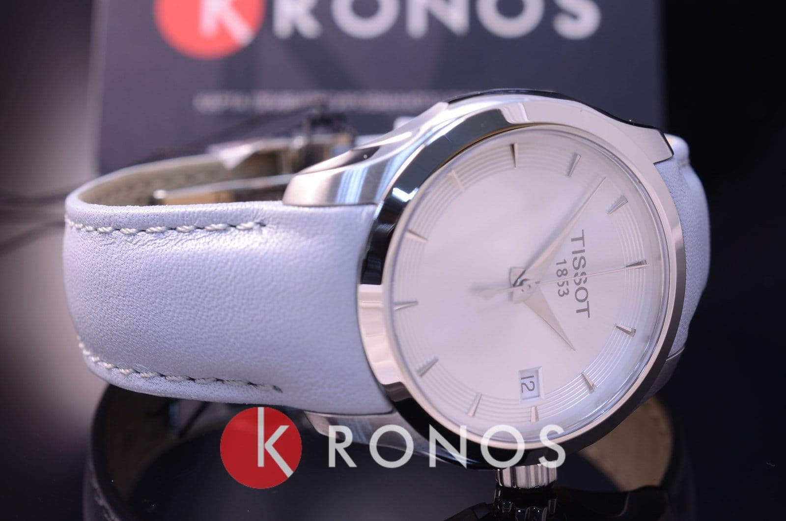 Компактная модель красиво смотрится на запястье, утончённости придаёт лаконичный кожаный ремешок нежно-голубого оттенка. Серебристый циферблат в минималистичном дизайне отличается элегантностью, ничто не мешает просмотру показателей. Высокую точность хода обеспечивается швейцарским кварцевым калибром ETA F05.111. Надёжное стекло из сапфира. Водостойкость до 10 бар. Корпус из нержавеющей стали 316L. . Апертура даты. Габариты: 32 x 32 x 8,1 мм.