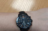 Чёрный фактурный циферблат никогда не утратит актуальности, брендовый аксессуар стильно смотрится на запястье и позволит вам всегда ощущать себя на высоте. В качестве материала для изготовления корпуса была выбрана нержавеющая сталь 316L с PDV покрытием. Кварцевый механизм ETA G10.211 с высокой точностью хода. Стекло из сапфира. Водонепроницаемость до 10 бар. Люминесцентная подсветкаЛюминесцентное покрытиеПозволяет считывать показания времени в темноте. Производители наносят на стрелки, часовые индексы, безель или поверхность циферблата светонакопительный состав, дающий холодное свечение.. Кожаный ремешок с оранжевой прострочкой. ХронографХронографФункция позволяет измерять отрезки времени с особой точностью: часы, минуты, секунды. Верным признаком хронографа является наличие на циферблате 3 дополнительных окошек-счётчиков., секундомер, индикация текущего числа, тахиметрТахиметрРазмеченная шкала, располагается на ободке или безеле часов. Тахиметр позволяет рассчитать скорость на определённом участке пути, расстояние измеряется в километрах или милях.. Габариты: 42 x 42 x 10,7 мм.