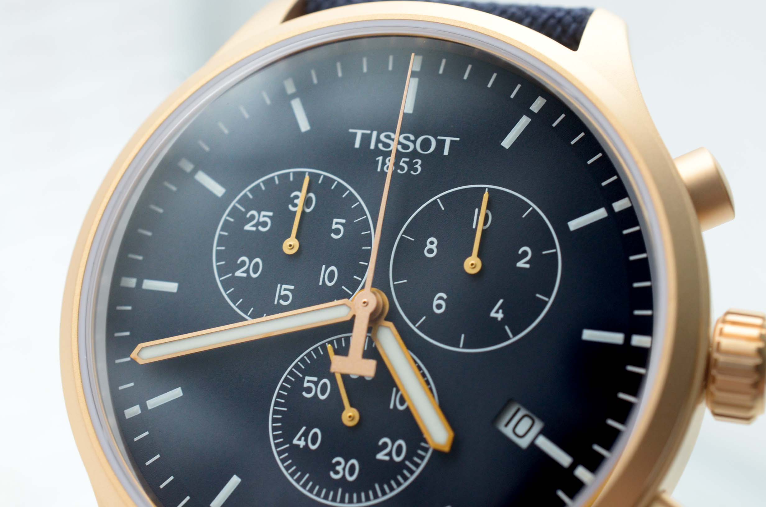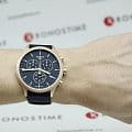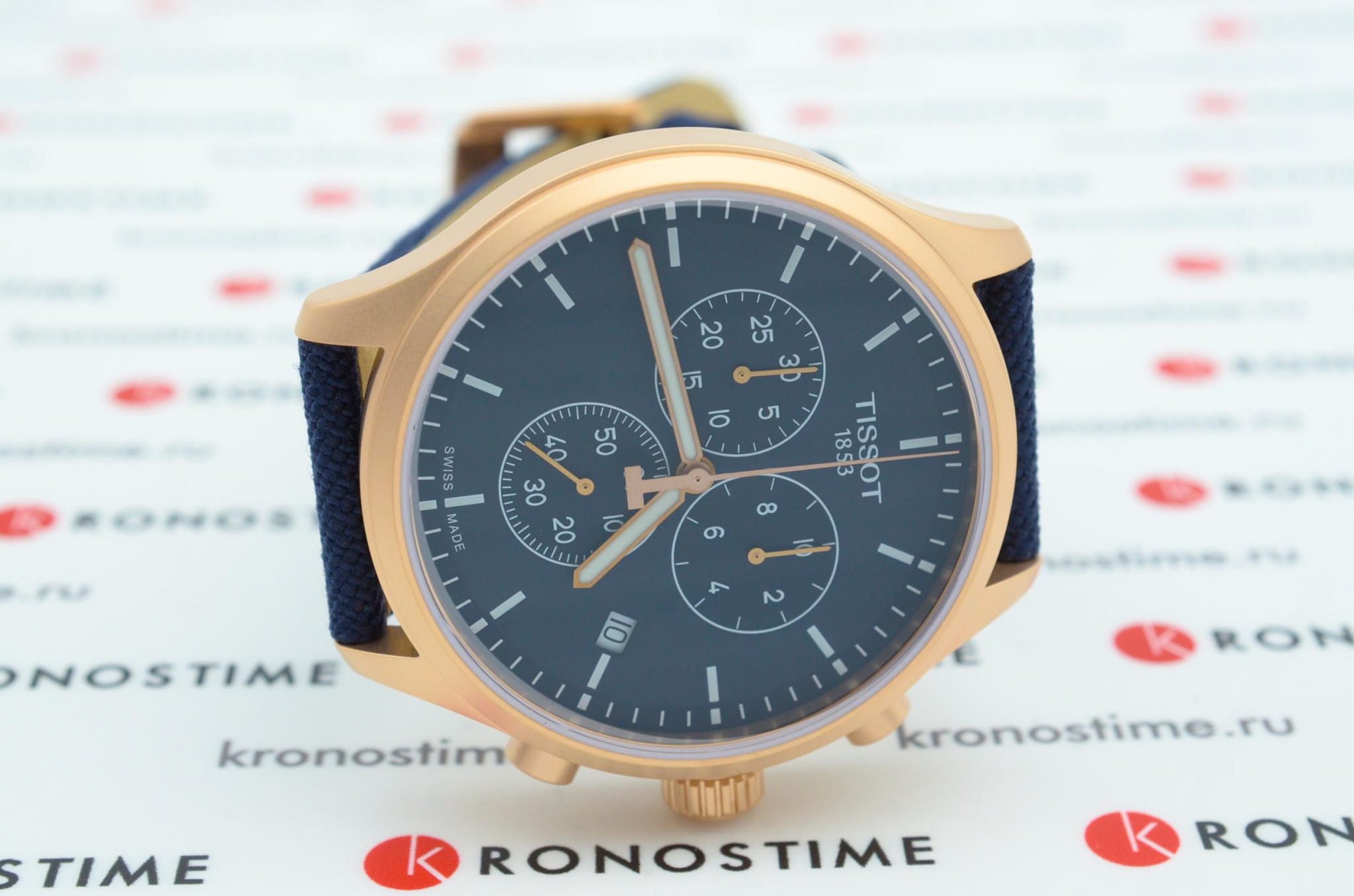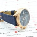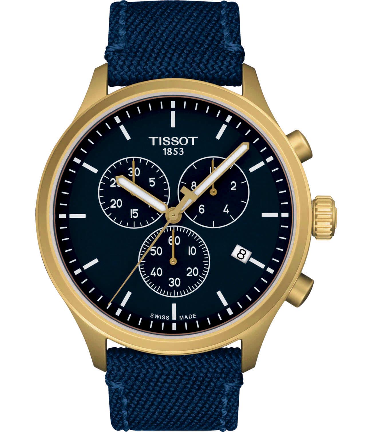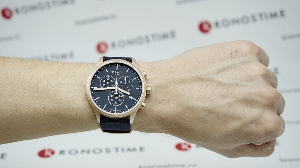 Брендовая модель станет лучшим дополнением к повседневному образу, стильно смотрится лаконичный синий циферблат. Плотный тканевый ремешок дарует лёгкость и обеспечивает комфортное ношение. Высокая точность хода достигается благодаря кварцевому механизму ETA G10.212. Сапфировое стекло устойчиво к возникновению царапин. Водонепроницаемость при давлении 10 бар. Золотистое PVD-покрытиеPVDУльтратонкое покрытие наносится в технике вакуумного напыления, сочетает в себе нитрид титана особой прочности со слоем золота или оксида хрома. Несёт в себе декоративную или защитную функцию. корпуса. Люминесцентная подсветкаЛюминесцентное покрытиеПозволяет считывать показания времени в темноте. Производители наносят на стрелки, часовые индексы, безель или поверхность циферблата светонакопительный состав, дающий холодное свечение.. Секундомер, хронографХронографФункция позволяет измерять отрезки времени с особой точностью: часы, минуты, секунды. Верным признаком хронографа является наличие на циферблате 3 дополнительных окошек-счётчиков., апертура даты. Габариты: 45 x 45 x 11 мм.