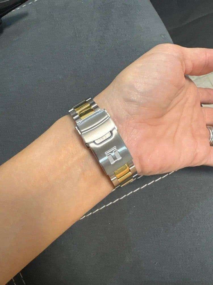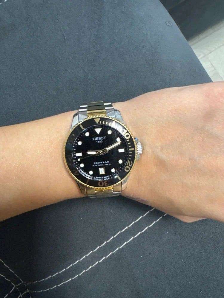Мужские швейцарские часы Tissot Seastar 1000 36mm T120.210.22.051.00, кварцевый механизм с высокой точностью. Сапфировое стеклоСапфировое стеклоПрочный и надёжный материал из кристалла сапфира синтетического происхождения, характеризующийся особой твёрдостью и устойчивостью к царапинам и повреждениям. устойчивое к появлению царапин, обладающее высокой прозрачностью. Корпус часов изготовлен из нержавеющей стали. Вращающийся безельБезельВнешний ободок, закрепляющий стекло. В спортивных часах так называется поворотное кольцо с делениями на циферблате, выполняет роль таймера – замеряет отрезки времени на шкале. Неподвижный безель – элемент декора. Однонаправленно вращающийся безель на дайверских часах позволяет фиксировать моменты погружения и выныривания на поверхность. из нержавеющей стали с PVD-покрытиемPVDУльтратонкое покрытие наносится в технике вакуумного напыления, сочетает в себе нитрид титана особой прочности со слоем золота или оксида хрома. Несёт в себе декоративную или защитную функцию.. Стрелки с люминесцентным покрытиемЛюминесцентное покрытиеПозволяет считывать показания времени в темноте. Производители наносят на стрелки, часовые индексы, безель или поверхность циферблата светонакопительный состав, дающий холодное свечение.. Окошко даты в положении 6 часов. Класс водозащиты: 200 метров, позволит плавать, нырять и заниматься другими водными видами спорта. Стальной браслет с частичным с PVD-покрытиемPVDУльтратонкое покрытие наносится в технике вакуумного напыления, сочетает в себе нитрид титана особой прочности со слоем золота или оксида хрома. Несёт в себе декоративную или защитную функцию. на раскладной застёжкеРаскладная застёжкаТакой тип застёжки используется только на браслетах из металла. Она никогда не раскрывается полностью, происходит разделение на 2 и более частей. Раскладывающая застёжка снизит вероятность потери часов к минимуму..