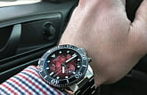 На фоне серебристого браслета и темного безеляБезельВнешний ободок, закрепляющий стекло. В спортивных часах так называется поворотное кольцо с делениями на циферблате, выполняет роль таймера – замеряет отрезки времени на шкале. Неподвижный безель – элемент декора. Однонаправленно вращающийся безель на дайверских часах позволяет фиксировать моменты погружения и выныривания на поверхность. ярко выделяется красный циферблат, отлично видны серебристые стрелки и часовые метки с люминесцентным покрытиемЛюминесцентное покрытиеПозволяет считывать показания времени в темноте. Производители наносят на стрелки, часовые индексы, безель или поверхность циферблата светонакопительный состав, дающий холодное свечение.. Завинчивающиеся кнопки, головка, прозрачная задняя крышка. Сапфировое стекло. Апертура даты. Габариты: 43 x 43 x 12,7 мм.