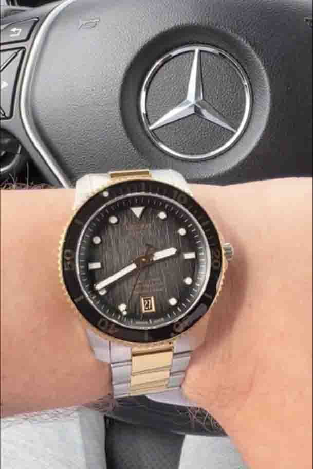 Модель в спортивном стиле дополнена элементами классического оформления. Степень водозащиты WR 300 позволяет использовать часы для дайвинга. Они работают за счёт механизма Powermatic 80Powermatic 80Эксклюзивный калибр от швейцарской компании ETA с увеличенным запасом хода до 80 часов за счёт удлинённой заводной пружины. Характеризуется улучшенной системой спуска со сниженным трением., запас хода составляет 80 часов. Прозрачная задняя крышка. Устойчивое к царапинам сапфировое стеклоСапфировое стеклоПрочный и надёжный материал из кристалла сапфира синтетического происхождения, характеризующийся особой твёрдостью и устойчивостью к царапинам и повреждениям. с антибликовым покрытием Корпус из нержавеющей стали с PVD-покрытиемPVDУльтратонкое покрытие наносится в технике вакуумного напыления, сочетает в себе нитрид титана особой прочности со слоем золота или оксида хрома. Несёт в себе декоративную или защитную функцию. из желтого золота. Однонаправленный керамический безельБезельВнешний ободок, закрепляющий стекло. В спортивных часах так называется поворотное кольцо с делениями на циферблате, выполняет роль таймера – замеряет отрезки времени на шкале. Неподвижный безель – элемент декора. Однонаправленно вращающийся безель на дайверских часах позволяет фиксировать моменты погружения и выныривания на поверхность.. Застёжка с фиксатором и удлинением для дайвингаУдлинение для дайверовЗастёжка с удлинением для дайверов представляет собой безопасное крепление, которое позволяет надевать часы поверх гидрокостюма. Гибкая застёжка удлиняется на 1-2 миллиметра.. Отображение текущего числа. Габариты: 40 x 40 x 12,5 мм.