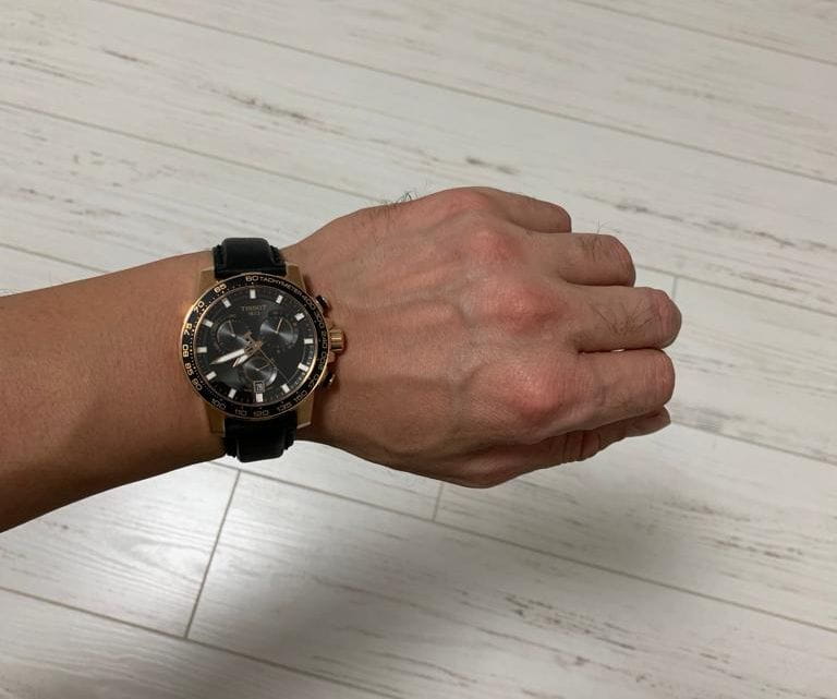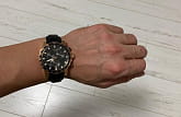 Аксессуар позволит грамотно дополнить образ, гармония чёрно-золотистой палитры никогда не потеряет актуальности. Наручные часы позволят всегда находиться в центре внимания. Массивный циферблат с крупной индикацией времени, симметричным расположением окошек – важная деталь для делового мужчины, привыкшего всё делать вовремя. Ремешок из тисненой натуральной кожи имеет белую прострочку, вдохновение идет от спортивных моделей. Швейцарский кварцевый механизм ETA G10.212. Сапфировое стекло. Корпус из нержавеющей стали 316L с цветным PVD-покрытиемPVDУльтратонкое покрытие наносится в технике вакуумного напыления, сочетает в себе нитрид титана особой прочности со слоем золота или оксида хрома. Несёт в себе декоративную или защитную функцию.. БезельБезельВнешний ободок, закрепляющий стекло. В спортивных часах так называется поворотное кольцо с делениями на циферблате, выполняет роль таймера – замеряет отрезки времени на шкале. Неподвижный безель – элемент декора. Однонаправленно вращающийся безель на дайверских часах позволяет фиксировать моменты погружения и выныривания на поверхность. размечен шкалой тахиметраТахиметрРазмеченная шкала, располагается на ободке или безеле часов. Тахиметр позволяет рассчитать скорость на определённом участке пути, расстояние измеряется в километрах или милях.. Водонепроницаемость до 10 бар. Люминесцентная подсветкаЛюминесцентное покрытиеПозволяет считывать показания времени в темноте. Производители наносят на стрелки, часовые индексы, безель или поверхность циферблата светонакопительный состав, дающий холодное свечение.. Секундомер, хронографХронографФункция позволяет измерять отрезки времени с особой точностью: часы, минуты, секунды. Верным признаком хронографа является наличие на циферблате 3 дополнительных окошек-счётчиков., индикация числа. Диаметр корпуса: 45,5 мм.