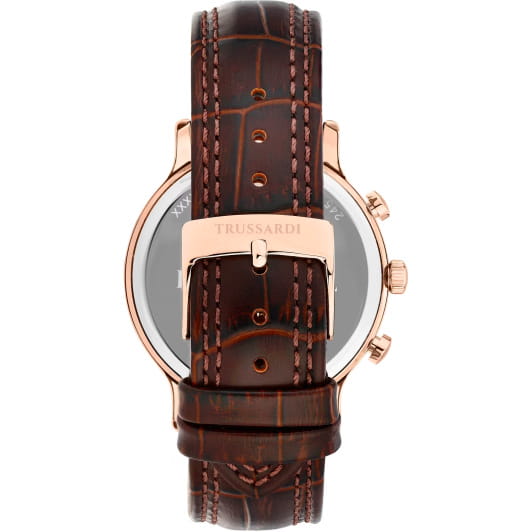 Итальянские мужские часы Trussardi T-Inedito R2451174001 - это стильный мужской аксессуар, который сочетает элегантный дизайн и практичность. Корпус выполнен из нержавеющей стали  с IP-покрытиемIP-покрытиеМетод ионного напыления. Демонстрирует повышенную устойчивость к истиранию, окислению и химическим веществам. Под воздействием высокого давления и температуры около 1500°C молекулы металла надёжно соединяются с частицами корпуса часов., что обеспечивает долговечность и утончённый внешний вид. Надежное минеральное стеклоМинеральное стеклоМинеральное стекло представляет собой искусственно выращенный минерал кварца. Такое стекло отличается особой устойчивостью к повреждениям и царапинам. Уступает по некоторым качествам сапфировому стеклу. защищает циферблат от царапин и обеспечивает долговечность. Модель оснащена кварцевым механизмом, обеспечивающим высокую точность хода. Кожаный ремень со стандартной застежкой обеспечивает комфортное ношение. Водозащита 50 метров позволит защитить корпус от случайных брызг или капель дождя. Вынесенный циферблат с 24-х часовым указателем времени, второй часовой пояс в 24-х часовом формате.Окошко даты находится в положении 6 часов. Эта модель – отличный выбор для тех, кто ищет сочетание стиля, качества и функциональности. Часы станут не только полезным аксессуаром, но и выразительным элементом вашего имиджа.