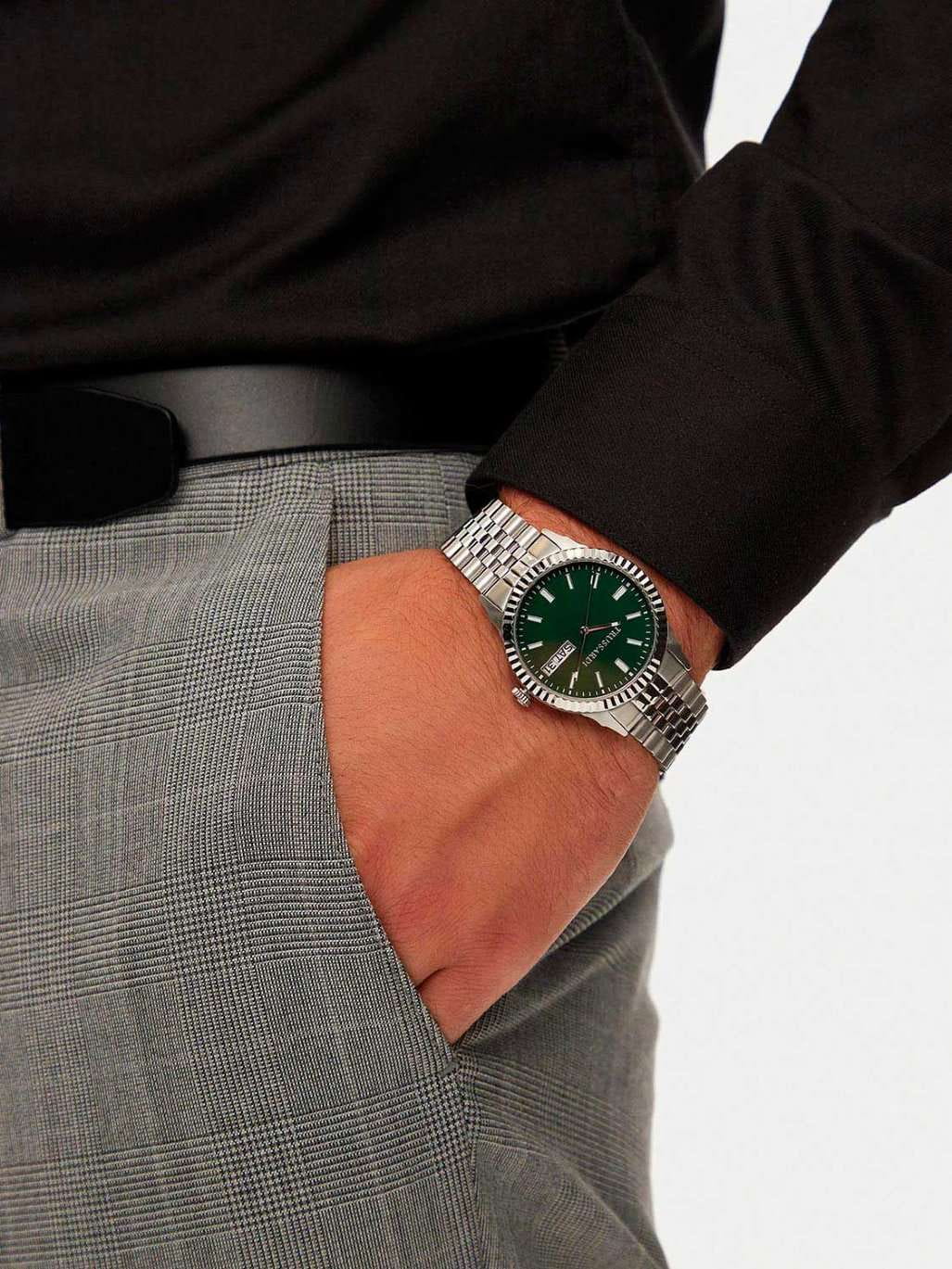 Итальянские мужские часы Trussardi T-Bent R2453141010 - это стильный мужской аксессуар, который сочетает элегантный дизайн и практичность. Корпус выполнен из нержавеющей стали, что обеспечивает долговечность и утончённый внешний вид. Надежное минеральное стеклоМинеральное стеклоМинеральное стекло представляет собой искусственно выращенный минерал кварца. Такое стекло отличается особой устойчивостью к повреждениям и царапинам. Уступает по некоторым качествам сапфировому стеклу. защищает циферблат от царапин и обеспечивает долговечность. Модель оснащена кварцевым механизмом, обеспечивающим высокую точность хода. Браслет из нержавеющей стали с раскладной застёжкойРаскладная застёжкаТакой тип застёжки используется только на браслетах из металла. Она никогда не раскрывается полностью, происходит разделение на 2 и более частей. Раскладывающая застёжка снизит вероятность потери часов к минимуму. обеспечивает комфортное ношение. Водозащита 50 метров позволит защитить корпус от случайных брызг или капель дождя. Окошки даты и дня недели находятся в положении 3 часа. Стрелки и метки оснащены люминесцентным покрытиемЛюминесцентное покрытиеПозволяет считывать показания времени в темноте. Производители наносят на стрелки, часовые индексы, безель или поверхность циферблата светонакопительный состав, дающий холодное свечение., обеспечивающим отличную видимость даже при слабом освещении. Эта модель – отличный выбор для тех, кто ищет сочетание стиля, качества и функциональности. Часы станут не только полезным аксессуаром, но и выразительным элементом вашего имиджа.