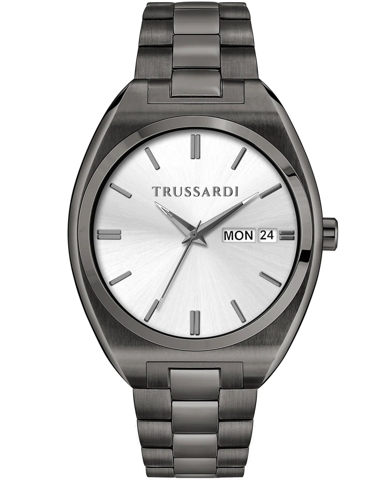 Итальянские мужские часы Trussardi Metropolitan R2453159004 - это стильный мужской аксессуар, который сочетает элегантный дизайн и практичность. Корпус выполнен из нержавеющей стали с IP-покрытиемIP-покрытиеМетод ионного напыления. Демонстрирует повышенную устойчивость к истиранию, окислению и химическим веществам. Под воздействием высокого давления и температуры около 1500°C молекулы металла надёжно соединяются с частицами корпуса часов., что обеспечивает долговечность и утончённый внешний вид. Надежное минеральное стеклоМинеральное стеклоМинеральное стекло представляет собой искусственно выращенный минерал кварца. Такое стекло отличается особой устойчивостью к повреждениям и царапинам. Уступает по некоторым качествам сапфировому стеклу. защищает циферблат от царапин и обеспечивает долговечность. Модель оснащена кварцевым механизмом, обеспечивающим высокую точность хода. Браслет из нержавеющей стали с IP-покрытиемIP-покрытиеМетод ионного напыления. Демонстрирует повышенную устойчивость к истиранию, окислению и химическим веществам. Под воздействием высокого давления и температуры около 1500°C молекулы металла надёжно соединяются с частицами корпуса часов.  с раскладной застёжкойРаскладная застёжкаТакой тип застёжки используется только на браслетах из металла. Она никогда не раскрывается полностью, происходит разделение на 2 и более частей. Раскладывающая застёжка снизит вероятность потери часов к минимуму. обеспечивает комфортное ношение. Водозащита 50 метров позволит защитить корпус от случайных брызг или капель дождя. Окошко даты и дня недели в положении 3 часов. Стрелки оснащены люминесцентным покрытиемЛюминесцентное покрытиеПозволяет считывать показания времени в темноте. Производители наносят на стрелки, часовые индексы, безель или поверхность циферблата светонакопительный состав, дающий холодное свечение., обеспечивающим отличную видимость даже при слабом освещении. Эта модель – отличный выбор для тех, кто ищет сочетание стиля, качества и функциональности. Часы станут не только полезным аксессуаром, но и выразительным элементом вашего имиджа.