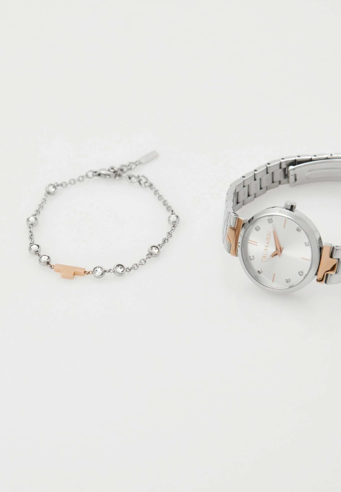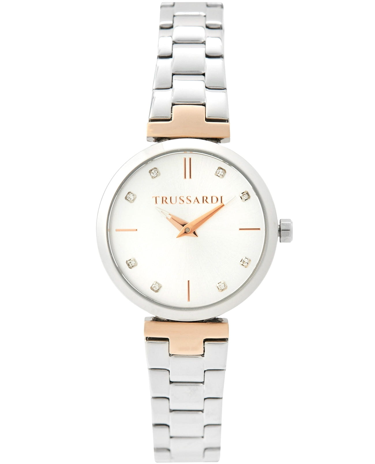 Итальянские женские часы Trussardi Loud R2453164508 - это стильный женский аксессуар, который сочетает элегантный дизайн и практичность. Корпус выполнен из нержавеющей стали, что обеспечивает долговечность и утончённый внешний вид. Надежное минеральное стеклоМинеральное стеклоМинеральное стекло представляет собой искусственно выращенный минерал кварца. Такое стекло отличается особой устойчивостью к повреждениям и царапинам. Уступает по некоторым качествам сапфировому стеклу. защищает циферблат с кристаллами от царапин и обеспечивает долговечность. Модель оснащена кварцевым механизмом, обеспечивающим высокую точность хода. Браслет из нержавеющей стали с частичным IP-покрытиемIP-покрытиеМетод ионного напыления. Демонстрирует повышенную устойчивость к истиранию, окислению и химическим веществам. Под воздействием высокого давления и температуры около 1500°C молекулы металла надёжно соединяются с частицами корпуса часов. на раскладной застёжкеРаскладная застёжкаТакой тип застёжки используется только на браслетах из металла. Она никогда не раскрывается полностью, происходит разделение на 2 и более частей. Раскладывающая застёжка снизит вероятность потери часов к минимуму. обеспечивает комфортное ношение. Стрелки оснащены люминесцентным покрытиемЛюминесцентное покрытиеПозволяет считывать показания времени в темноте. Производители наносят на стрелки, часовые индексы, безель или поверхность циферблата светонакопительный состав, дающий холодное свечение., обеспечивающим отличную видимость даже при слабом освещении. Водозащита 50 метров позволит защитить корпус от случайных брызг или капель дождя. Эта модель – отличный выбор для тех, кто ищет сочетание стиля, качества и функциональности. Часы станут не только полезным аксессуаром, но и выразительным элементом вашего имиджа. В комплекте браслет.