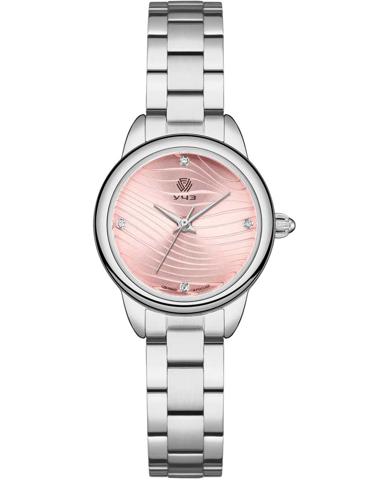 УЧЗ Spectr 3069B-2 — стильная женская модель, сочетающая элегантный дизайн и чёткую функциональность для ежедневной носки. Круглый корпус выполнен из стали, размером 28 мм, гармонично дополнен стальным браслетом на застёжке-бабочкеЗастёжка "бабочка"Такой вид застёжки дополняется предохранителями, помогающими избежать случайного раскрытия браслета. Обладают изящным исполнением. . Циферблат с акцентными минималистичными стрелками и метками в виде кристаллов делает модель более практичной. Минеральное стеклоМинеральное стеклоМинеральное стекло представляет собой искусственно выращенный минерал кварца. Такое стекло отличается особой устойчивостью к повреждениям и царапинам. Уступает по некоторым качествам сапфировому стеклу., закалённое для защиты от мелких повреждений, а кварцевый механизм обеспечивает высокую точность. Водозащита до 30 метров, благодаря чему корпус защищён от брызг воды и дождя. Идеальный выбор для тех, кто ценит элегантный дизайн и качество.