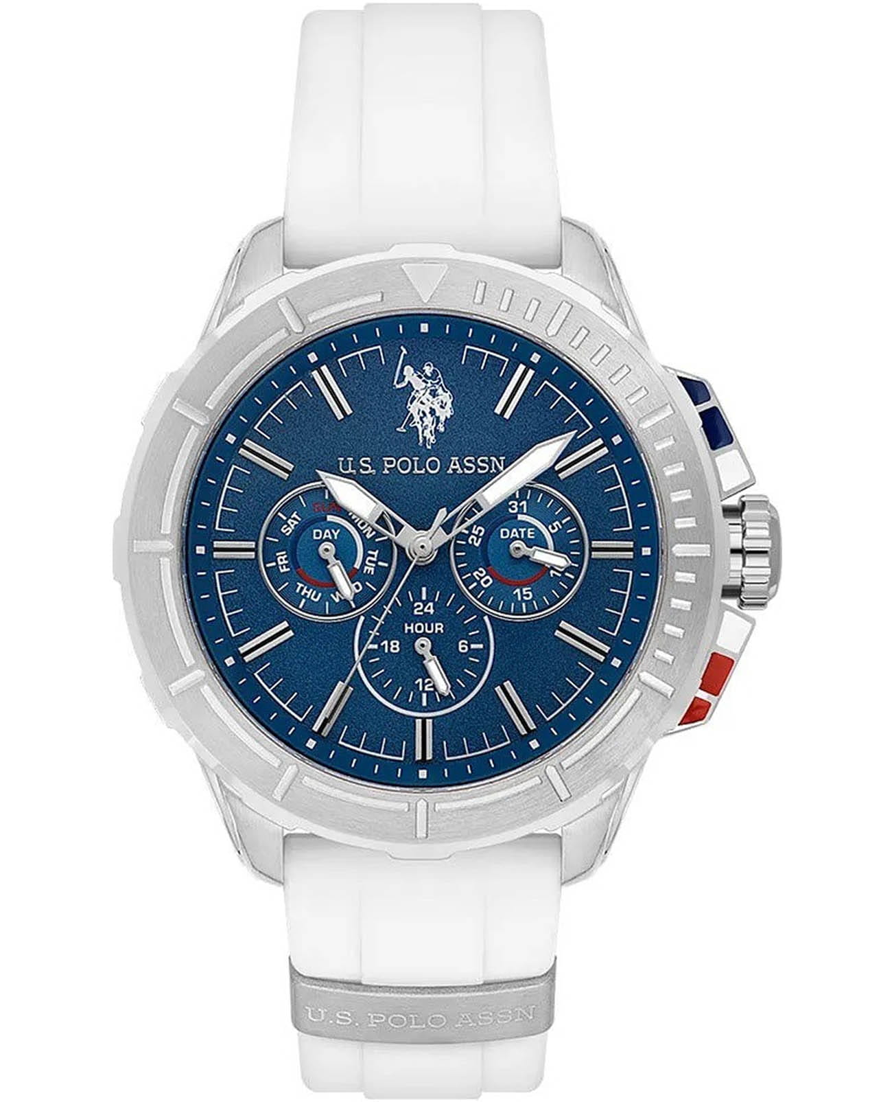 Мужские изысканные американские часы U.S. Polo Assn. Crossing USPA1066-01, кварцевый механизм с высокой точностью. Минеральное стеклоМинеральное стеклоМинеральное стекло представляет собой искусственно выращенный минерал кварца. Такое стекло отличается особой устойчивостью к повреждениям и царапинам. Уступает по некоторым качествам сапфировому стеклу. устойчивое к появлению царапин, обладающее высокой прозрачностью. Корпус изготовлен из нержавеющей стали с поворотным безелемБезельВнешний ободок, закрепляющий стекло. В спортивных часах так называется поворотное кольцо с делениями на циферблате, выполняет роль таймера – замеряет отрезки времени на шкале. Неподвижный безель – элемент декора. Однонаправленно вращающийся безель на дайверских часах позволяет фиксировать моменты погружения и выныривания на поверхность.. На стильном синем циферблате три дополнительных индикатора. Центральные часовая, минутная и секундная стрелки. Индикация даты и дня недели. 12/24х часовой формат времени. Класс водозащиты: 50 метров, позволит защитить корпус от случайных брызг или капель дождя. Силиконовый ремешок белого цвета со стандартной застежкой безупречно дополняет корпус. Стрелки оснащены люминесцентным покрытиемЛюминесцентное покрытиеПозволяет считывать показания времени в темноте. Производители наносят на стрелки, часовые индексы, безель или поверхность циферблата светонакопительный состав, дающий холодное свечение., обеспечивающим хорошую читаемость в темноте. Модель подчёркивает индивидуальность владельца и идеально подходит как для повседневного, так и для делового образа.