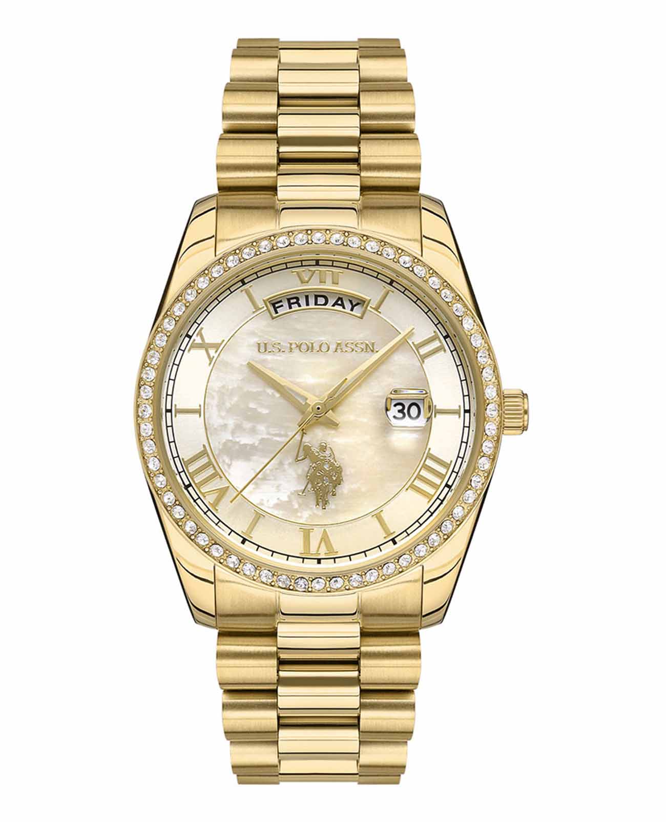 Женские часы U.S. Polo Assn Stile USPA2054-08, кварцевый механизм с высокой точностью. Минеральное стеклоМинеральное стеклоМинеральное стекло представляет собой искусственно выращенный минерал кварца. Такое стекло отличается особой устойчивостью к повреждениям и царапинам. Уступает по некоторым качествам сапфировому стеклу. устойчивое к появлению царапин, обладающее высокой прозрачностью. Корпус изготовлен из нержавеющей стали с IP-покрытиемIP-покрытиеМетод ионного напыления. Демонстрирует повышенную устойчивость к истиранию, окислению и химическим веществам. Под воздействием высокого давления и температуры около 1500°C молекулы металла надёжно соединяются с частицами корпуса часов.. БезельБезельВнешний ободок, закрепляющий стекло. В спортивных часах так называется поворотное кольцо с делениями на циферблате, выполняет роль таймера – замеряет отрезки времени на шкале. Неподвижный безель – элемент декора. Однонаправленно вращающийся безель на дайверских часах позволяет фиксировать моменты погружения и выныривания на поверхность. украшен кристаллами. Окошко даты находится в положении 3 часа. Класс водозащиты: 30 метров, позволит защитить корпус от случайных брызг или капель дождя. Стальной браслет с IP-покрытиемIP-покрытиеМетод ионного напыления. Демонстрирует повышенную устойчивость к истиранию, окислению и химическим веществам. Под воздействием высокого давления и температуры около 1500°C молекулы металла надёжно соединяются с частицами корпуса часов. на застёжке-бабочке с кнопкамиЗастёжка "бабочка"Такой вид застёжки дополняется предохранителями, помогающими избежать случайного раскрытия браслета. Обладают изящным исполнением. .