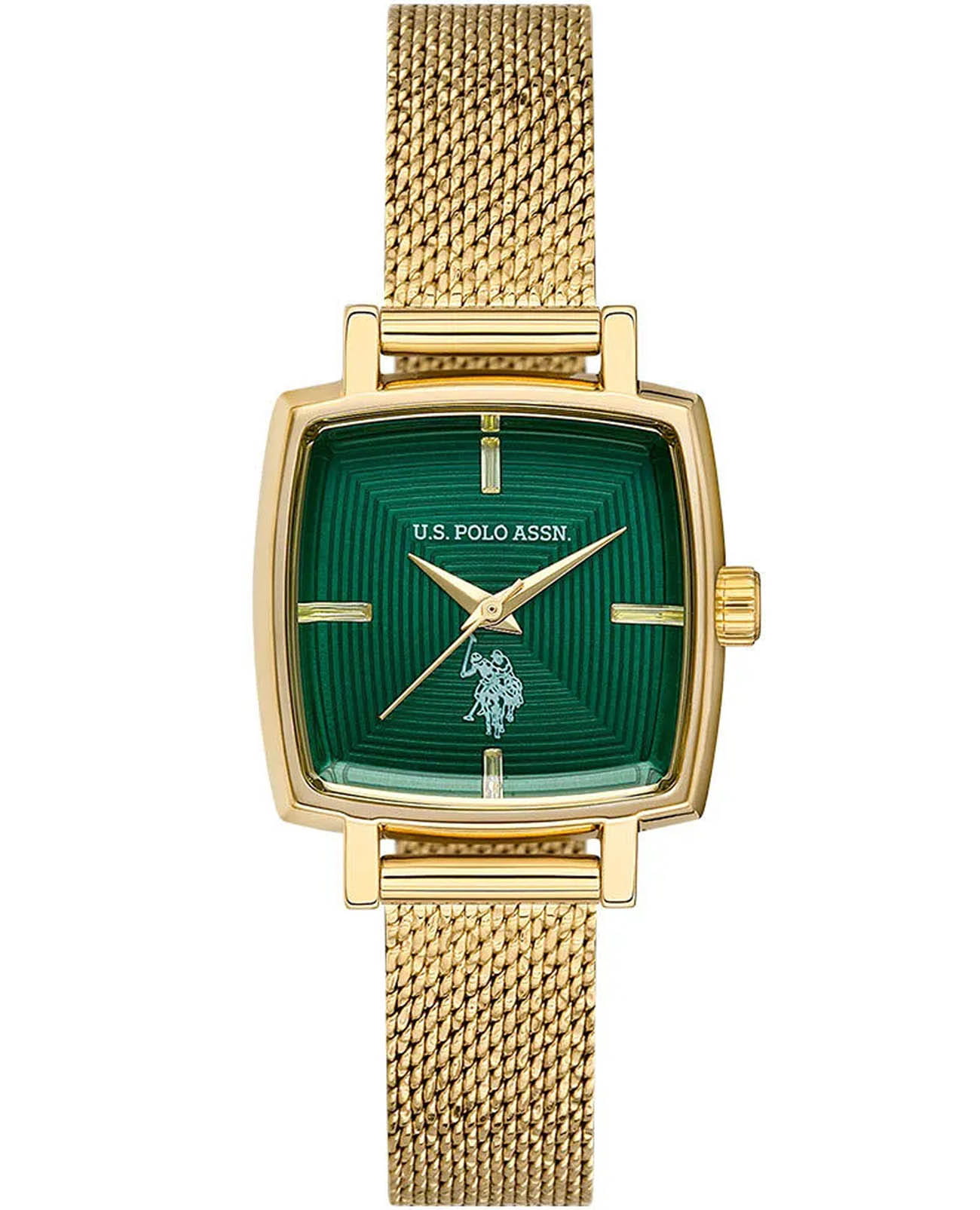Женские наручные часы U.S. Polo Assn. Stile USPA2066-04 — это стильный и лаконичный аксессуар, выполненный в форме квадрата. Модель изготовлена из стали с PVD-покрытиемPVDУльтратонкое покрытие наносится в технике вакуумного напыления, сочетает в себе нитрид титана особой прочности со слоем золота или оксида хрома. Несёт в себе декоративную или защитную функцию. цвета желтого золота, придающий благородный внешний вид и устойчивость к царапинам. Циферблат зеленого цвета дополнен секундной стрелкой, обеспечивающей точность отсчёта времени. Защиту циферблата обеспечивает минеральное стеклоМинеральное стеклоМинеральное стекло представляет собой искусственно выращенный минерал кварца. Такое стекло отличается особой устойчивостью к повреждениям и царапинам. Уступает по некоторым качествам сапфировому стеклу., устойчивое к мелким повреждениям. Часы оснащены кварцевым механизмом, гарантирующим точность и минимальное обслуживание. Водонепроницаемость 3 АТМ позволяет использовать часы в повседневных условиях — при мытье рук или под лёгким дождём. Браслет выполнен в технике миланской сетки из стали с PVD-покрытиемPVDУльтратонкое покрытие наносится в технике вакуумного напыления, сочетает в себе нитрид титана особой прочности со слоем золота или оксида хрома. Несёт в себе декоративную или защитную функцию. и оснащён раскладным замкомРаскладной замокДанный вариант застежки используется только на часах с металлическим браслетом. Отличительная особенность такого крепления в том, что длина браслета становится универсальной и вы можете самостоятельно отрегулировать нужный вам размер – застежка просто двигается по браслету часов., обеспечивающей комфорт и уверенную фиксацию на запястье. Толщина корпуса составляет 10 мм, а его размер 26 мм, что делает часы компактными и удобными в носке. Эти часы станут универсальным аксессуаром для уверенных в себе женщин, которые ценят сочетание стиля, качества и эстетики — идеальный выбор для повседневного образа и торжественных случаев.