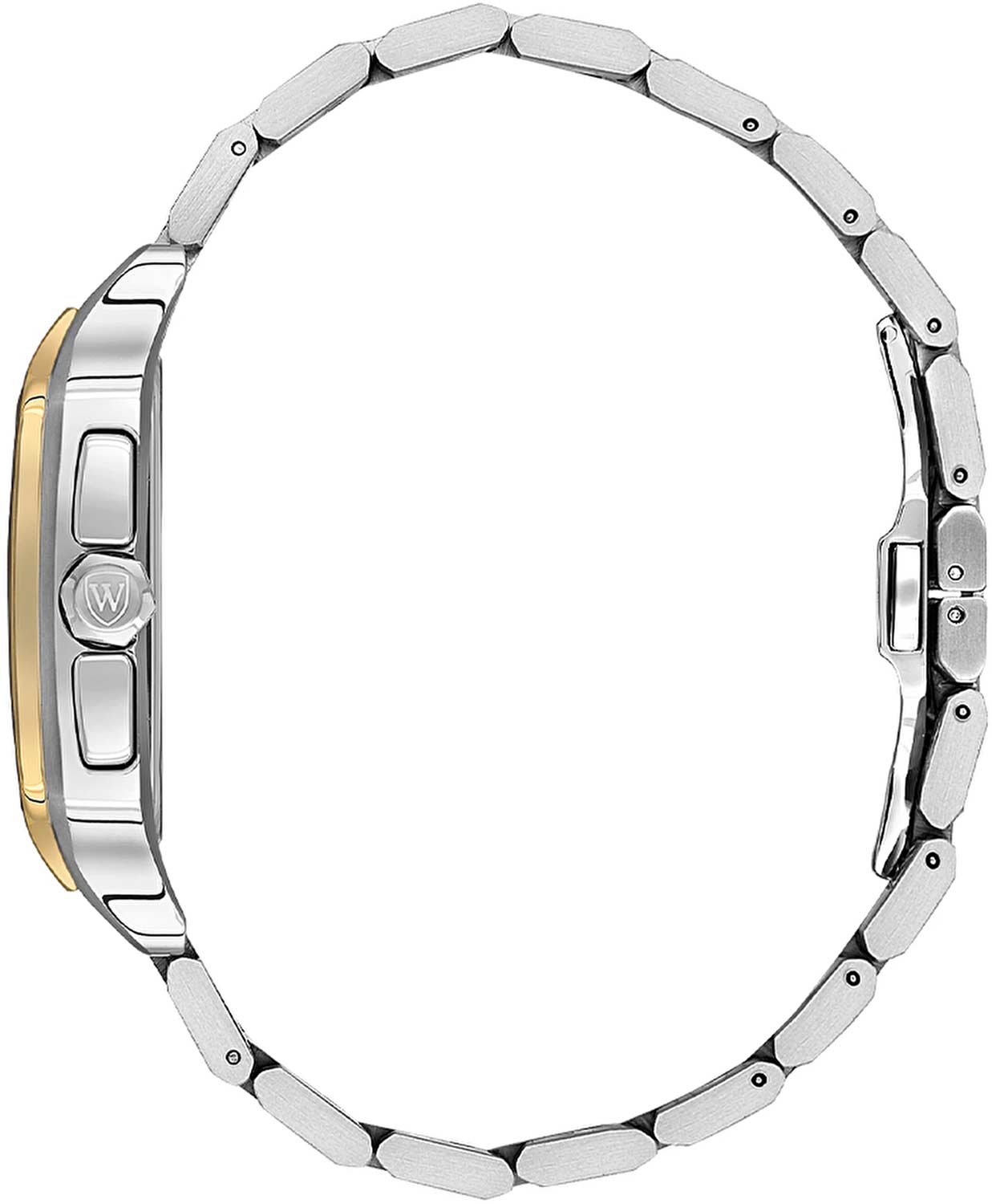 Мужские кварцевые часы Wainer WA.18090-E — это стильный аксессуар, сочетающий в себе швейцарское качество и изысканный дизайн. Модель выполнена в квадратной форме из стали 316L с частичным PVD-покрытиемPVDУльтратонкое покрытие наносится в технике вакуумного напыления, сочетает в себе нитрид титана особой прочности со слоем золота или оксида хрома. Несёт в себе декоративную или защитную функцию., что придаёт ей благородный внешний вид и устойчивость к царапинам. Корпус украшен декоративными винтами, подчёркивая внимание к деталям. Циферблат белого цвета дополнен штриховыми метками и римскими цифрами, а секундная стрелка на конце декорирована буквой W, добавляя модели индивидуальности. Защиту механизма обеспечивает сапфировое стеклоСапфировое стеклоПрочный и надёжный материал из кристалла сапфира синтетического происхождения, характеризующийся особой твёрдостью и устойчивостью к царапинам и повреждениям., устойчивое к повреждениям. Окошко даты расположено в положении 4 часов, а гранёная заводная головка с защитой оснащена фирменным логотипом. Браслет из стали 316L шириной 22 мм оснащён Раскладная застёжкаРаскладная застёжкаТакой тип застёжки используется только на браслетах из металла. Она никогда не раскрывается полностью, происходит разделение на 2 и более частей. Раскладывающая застёжка снизит вероятность потери часов к минимуму., обеспечивающей комфорт и надёжную фиксацию на запястье. Водонепроницаемость позволяет использовать модель при мытье рук или под лёгким дождём. Стрелки с люминесцентным покрытиемЛюминесцентное покрытиеПозволяет считывать показания времени в темноте. Производители наносят на стрелки, часовые индексы, безель или поверхность циферблата светонакопительный состав, дающий холодное свечение. обеспечивают отличную читаемость даже в условиях слабого освещения. Механизм калибра Ronda 5030.D гарантирует точность хода и надёжность. Эти часы станут универсальным аксессуаром для тех, кто ценит сочетание стиля, функциональности и швейцарского мастерства — идеальный выбор для повседневной носки и торжественных случаев.