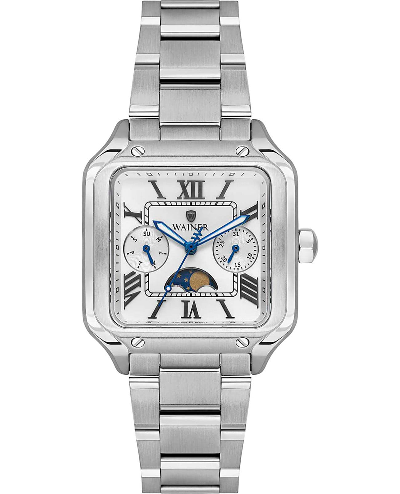 Женские кварцевые часы Wainer WA.18091-A — это стильный аксессуар, сочетающий в себе швейцарское качество и изысканный дизайн. Модель выполнена в квадратной форме из стали 316L с декоративными винтами, что придаёт ей прочность и устойчивость к царапинам. Циферблат белого цвета дополнен штриховыми метками и римскими цифрами, а секундная стрелка на конце декорирована буквой W, подчёркивая внимание к деталям. Число, день недели и индикатор фазы Луны вынесены на отдельные циферблаты, что делает модель функциональной и выразительной. Защиту механизма обеспечивает сапфировое стеклоСапфировое стеклоПрочный и надёжный материал из кристалла сапфира синтетического происхождения, характеризующийся особой твёрдостью и устойчивостью к царапинам и повреждениям., устойчивое к повреждениям. Гранёная заводная головка с защитой оснащена фирменным логотипом, добавляя модели индивидуальности. Браслет из стали 316L шириной 16 мм оснащён Раскладная застёжкаРаскладная застёжкаТакой тип застёжки используется только на браслетах из металла. Она никогда не раскрывается полностью, происходит разделение на 2 и более частей. Раскладывающая застёжка снизит вероятность потери часов к минимуму., обеспечивающей комфорт и надёжную фиксацию на запястье. Водонепроницаемость позволяет использовать модель при мытье рук или под лёгким дождём. Стрелки с люминесцентным покрытиемЛюминесцентное покрытиеПозволяет считывать показания времени в темноте. Производители наносят на стрелки, часовые индексы, безель или поверхность циферблата светонакопительный состав, дающий холодное свечение. обеспечивают отличную читаемость даже в условиях слабого освещения. Механизм калибра Ronda 706.1 гарантирует точность хода и надёжность. Эти часы станут универсальным аксессуаром для тех, кто ценит сочетание стиля, функциональности и швейцарского мастерства — идеальный выбор для повседневной носки и торжественных случаев.