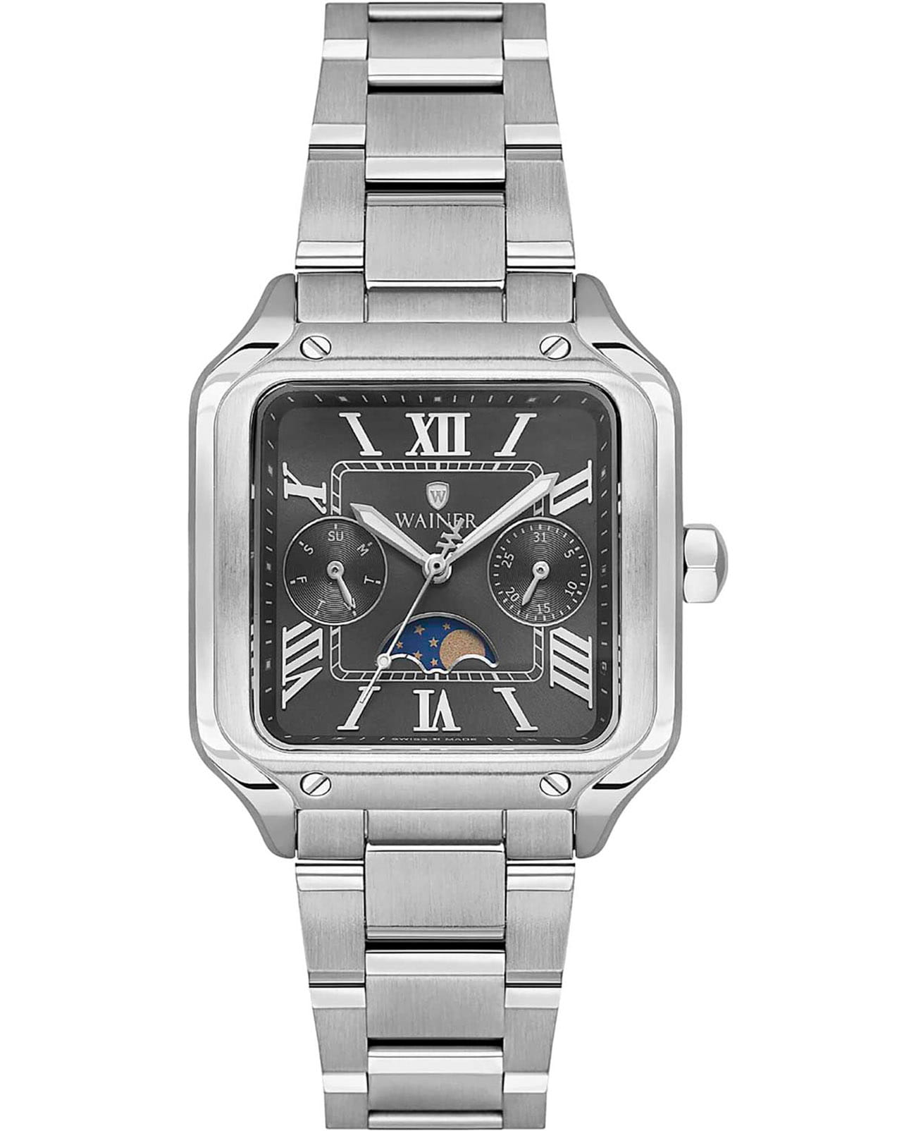 Женские кварцевые часы Wainer WA.18091-D — это стильный аксессуар, сочетающий в себе швейцарское качество и изысканный дизайн. Модель выполнена в квадратной форме из стали 316L с декоративными винтами, что придаёт ей прочность и устойчивость к царапинам. Циферблат дополнен штриховыми метками и римскими цифрами, а секундная стрелка на конце декорирована буквой W, подчёркивая внимание к деталям. Число, день недели и индикатор фазы Луны вынесены на отдельные циферблаты, что делает модель функциональной и выразительной. Защиту механизма обеспечивает сапфировое стеклоСапфировое стеклоПрочный и надёжный материал из кристалла сапфира синтетического происхождения, характеризующийся особой твёрдостью и устойчивостью к царапинам и повреждениям., устойчивое к повреждениям. Гранёная заводная головка с защитой оснащена фирменным логотипом, добавляя модели индивидуальности. Браслет из стали 316L шириной 16 мм оснащён Раскладная застёжкаРаскладная застёжкаТакой тип застёжки используется только на браслетах из металла. Она никогда не раскрывается полностью, происходит разделение на 2 и более частей. Раскладывающая застёжка снизит вероятность потери часов к минимуму., обеспечивающей комфорт и надёжную фиксацию на запястье. Водонепроницаемость позволяет использовать модель при мытье рук или под лёгким дождём. Стрелки с люминесцентным покрытиемЛюминесцентное покрытиеПозволяет считывать показания времени в темноте. Производители наносят на стрелки, часовые индексы, безель или поверхность циферблата светонакопительный состав, дающий холодное свечение. обеспечивают отличную читаемость даже в условиях слабого освещения. Механизм калибра Ronda 706.1 гарантирует точность хода и надёжность. Эти часы станут универсальным аксессуаром для тех, кто ценит сочетание стиля, функциональности и швейцарского мастерства — идеальный выбор для повседневной носки и торжественных случаев.